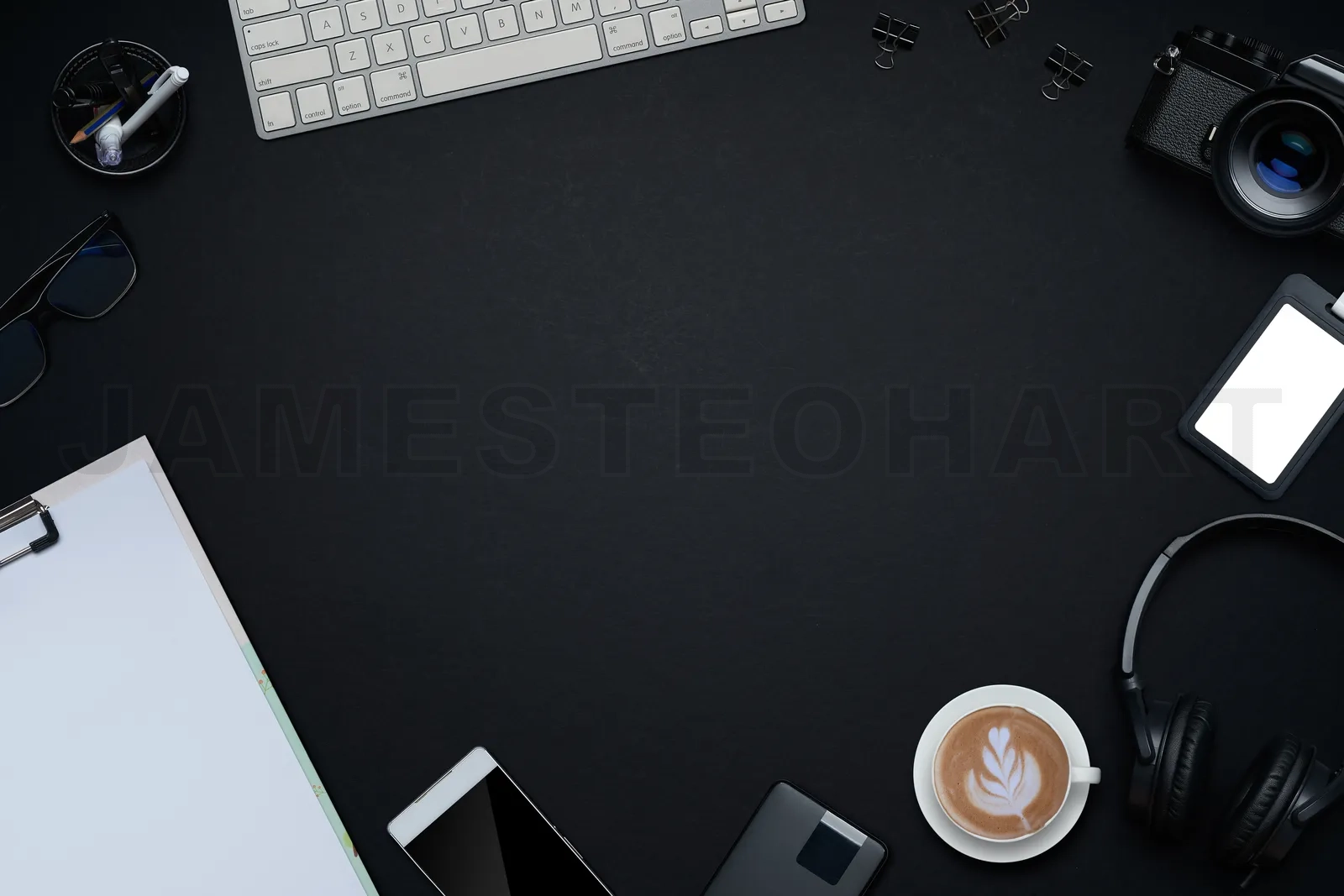Workspace desk with modern technology and latte coffee, creating a productive overhead view