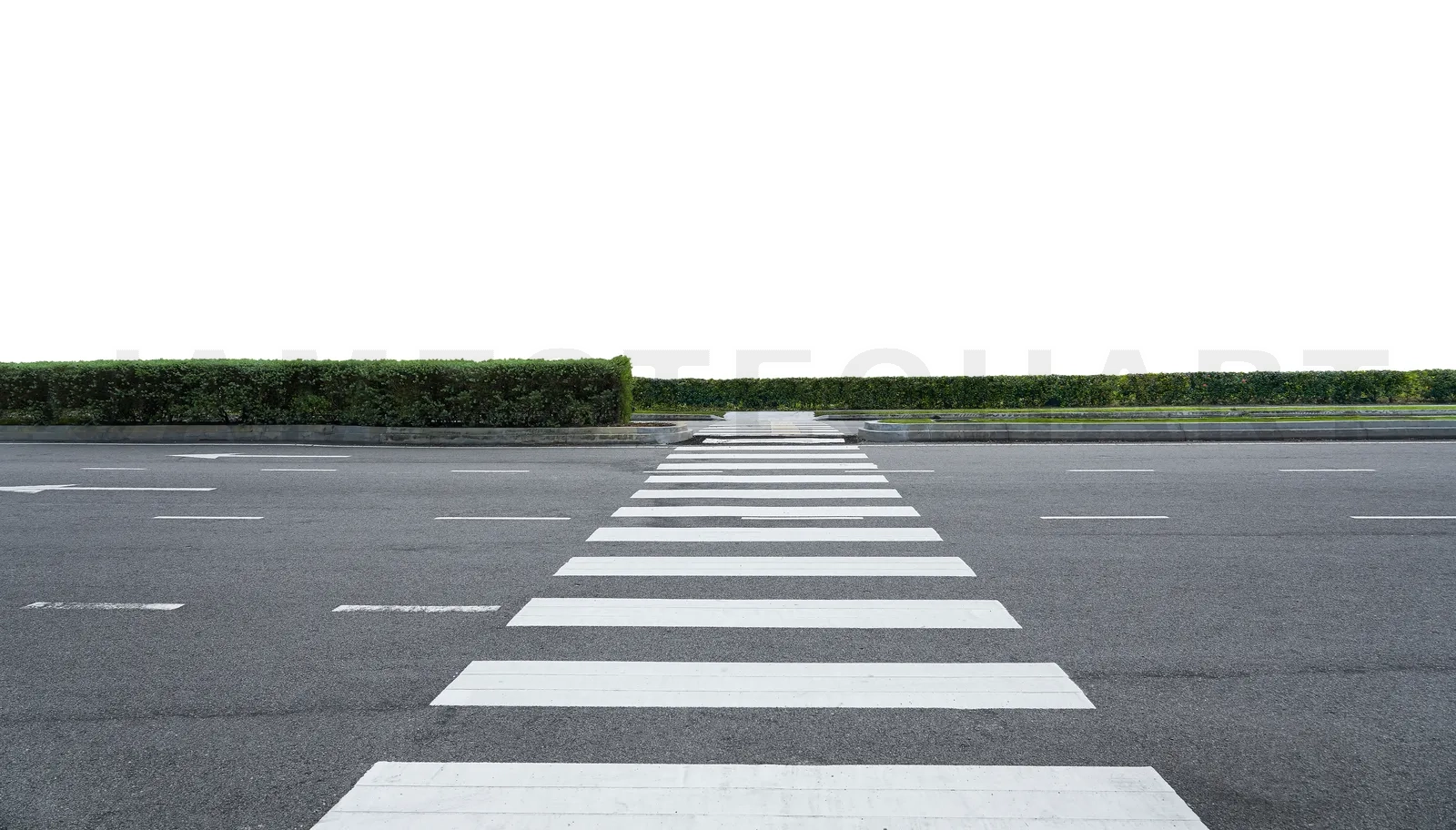 Pedestrian crosswalk on a road with white lines and a green hedge, isolated on white