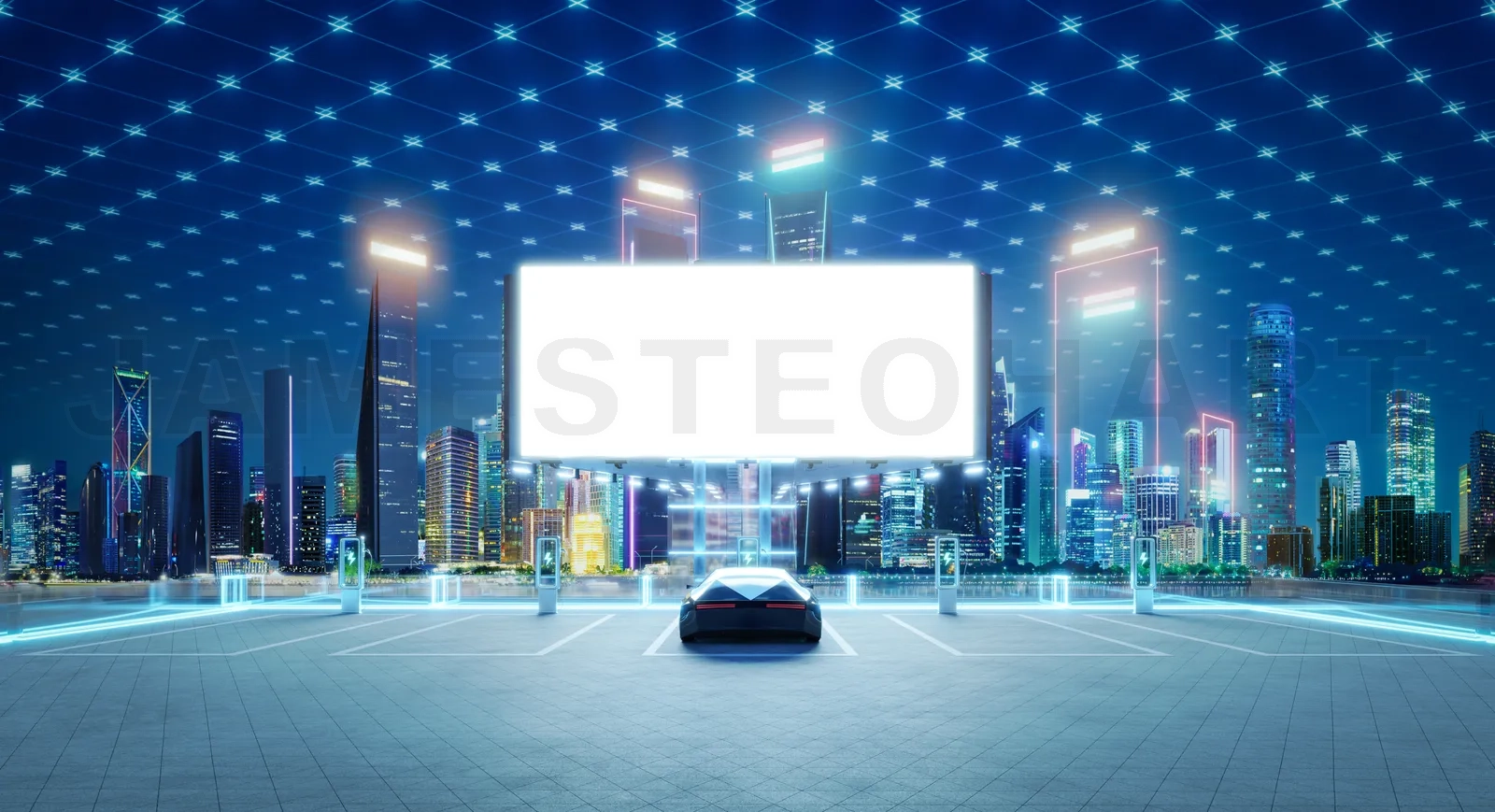 Modern electric vehicle charging at futuristic parking lot with blank billboard and illuminated cityscape at night. 3D rendering