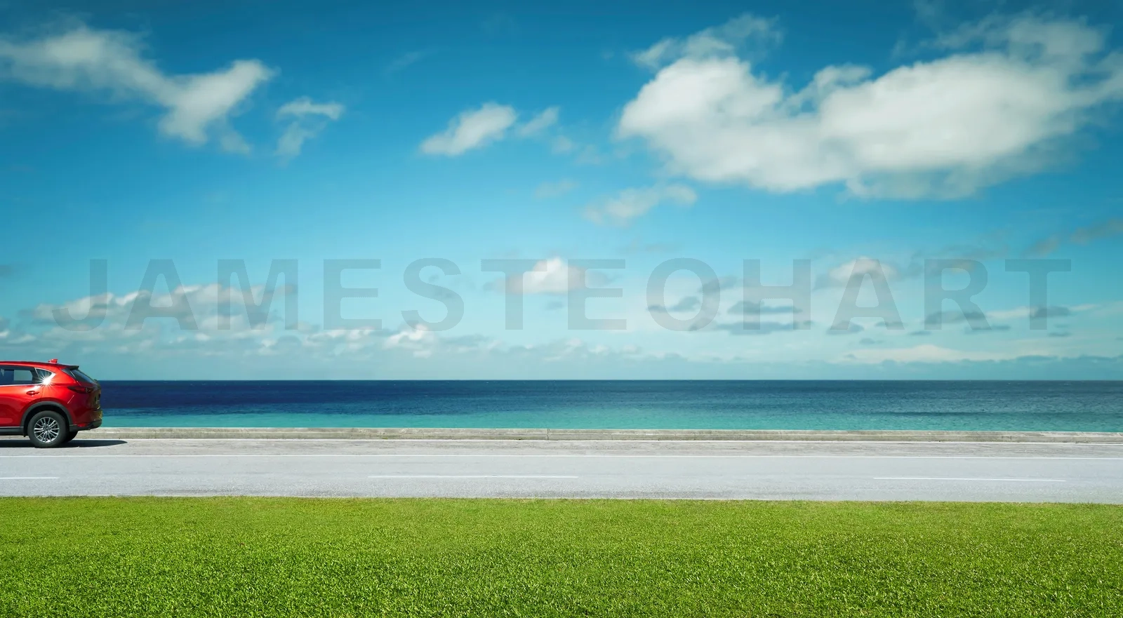 Electric SUV red car parked on road side with beautiful seacoast.