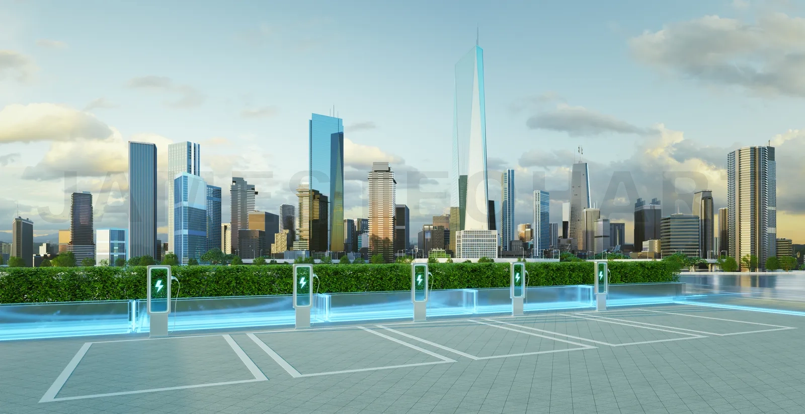 Electric vehicle charging station showing charging power with a futuristic city skyline in the background. 3D rendering