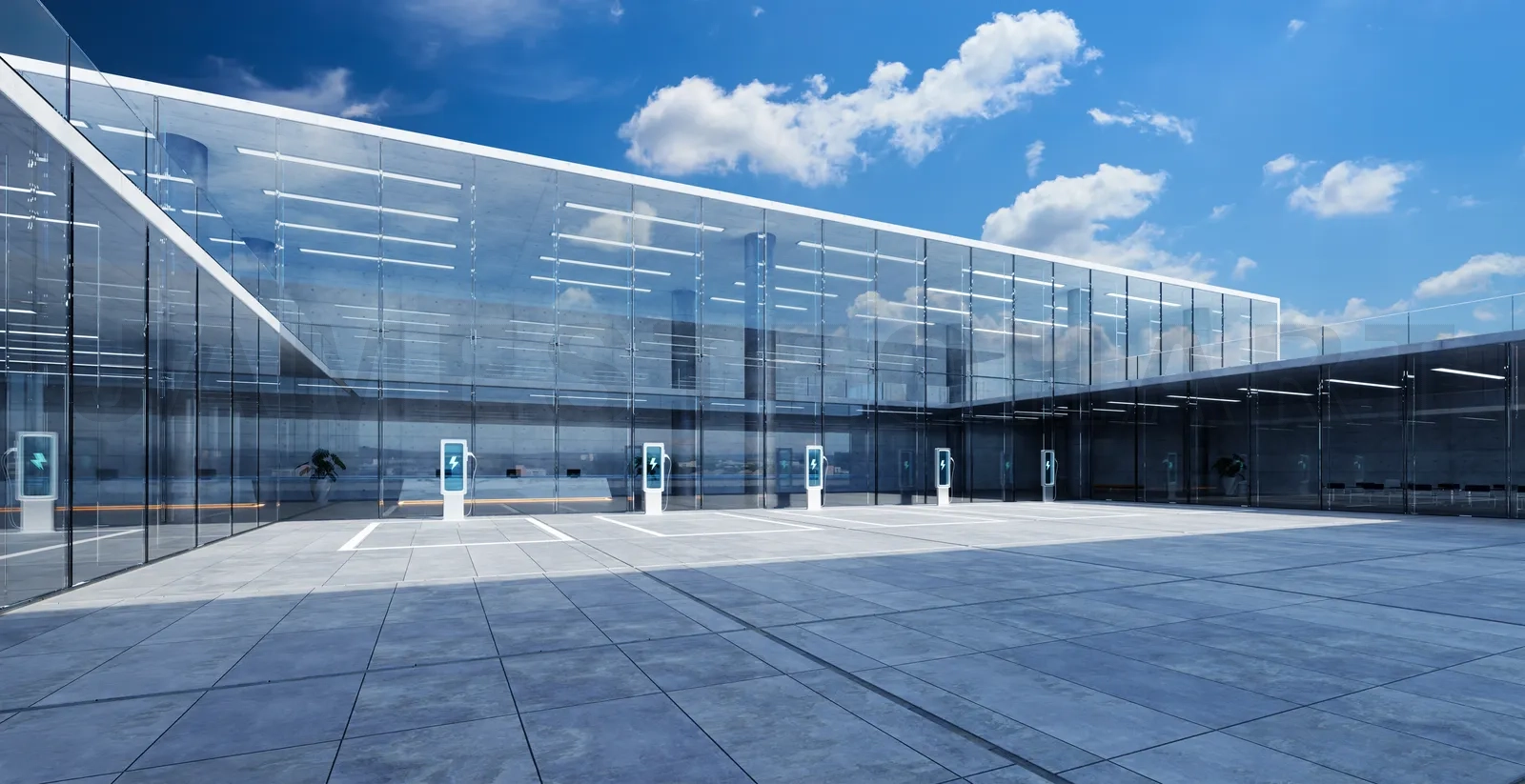 Empty parking lot with charging stations in front of a modern glass office building, promoting sustainable transportation. 3D rendering