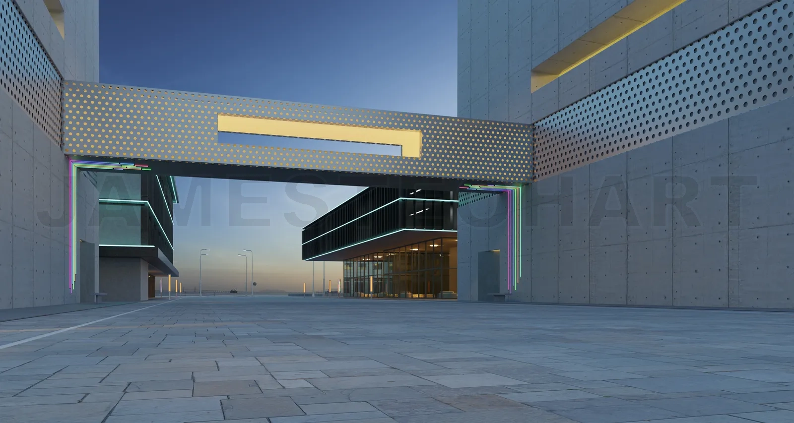 Empty brick road nearby modern building. 3d rendering