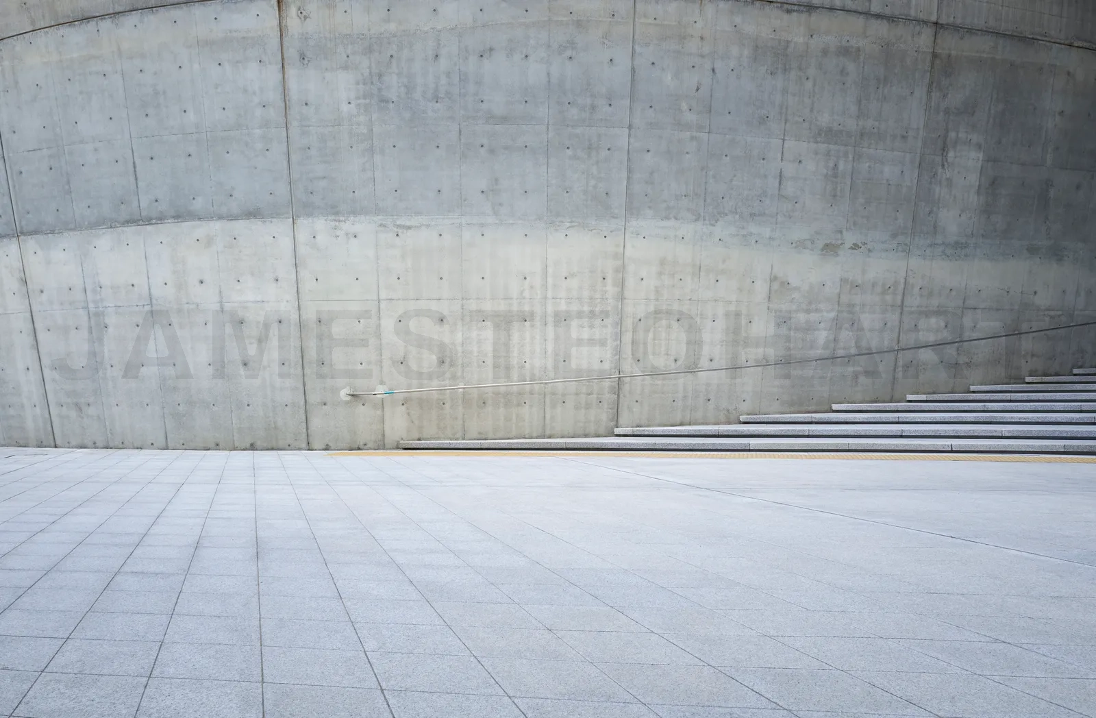 Modern urban square featuring a large curved concrete wall, steps, and tiled pavement