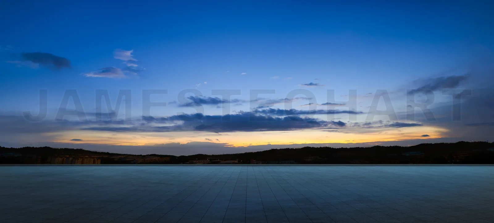 Empty tiles floor with dramatic suset sky