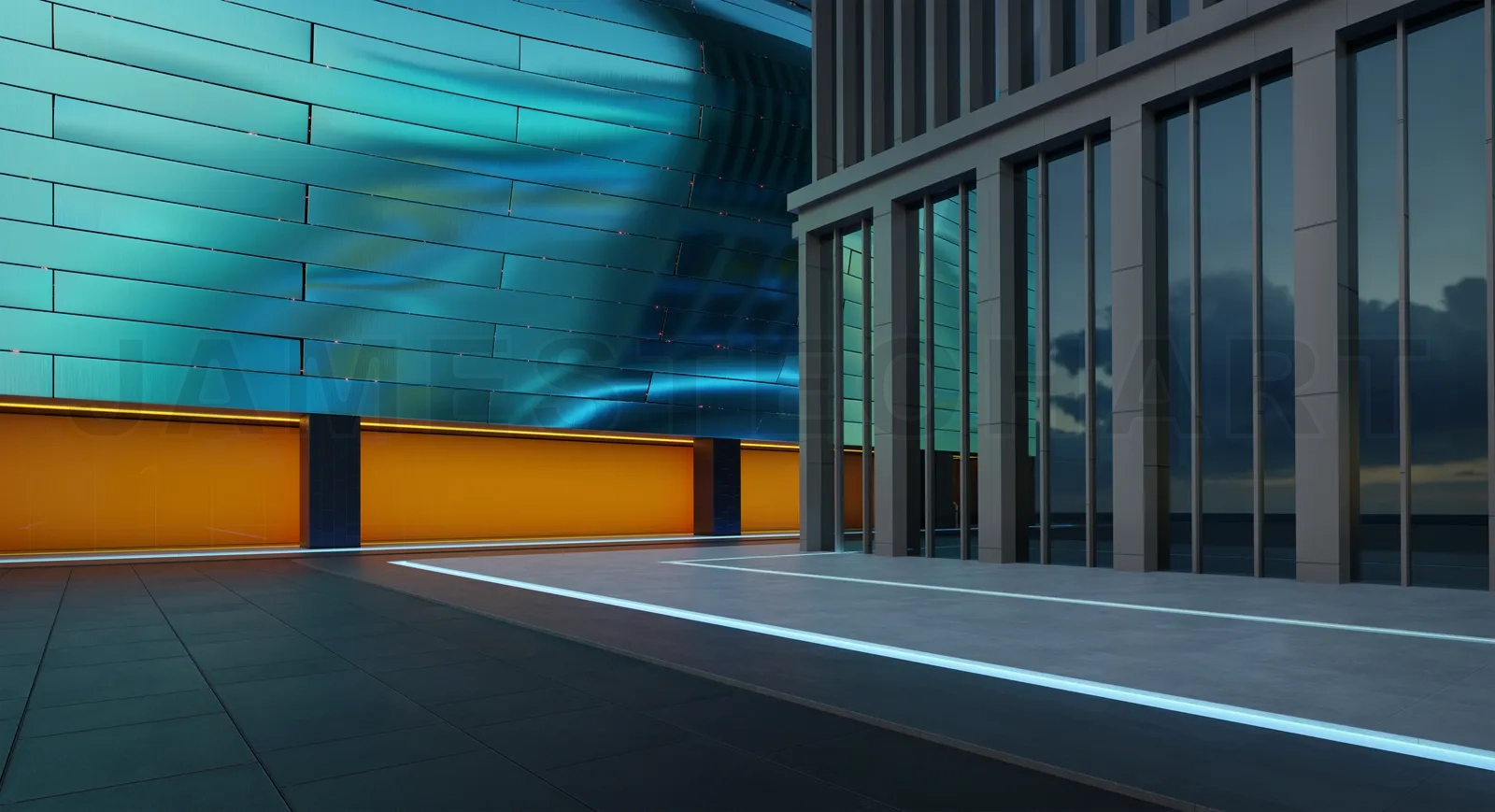 Empty floor with modern buildings with orange glass window. 3d rendering