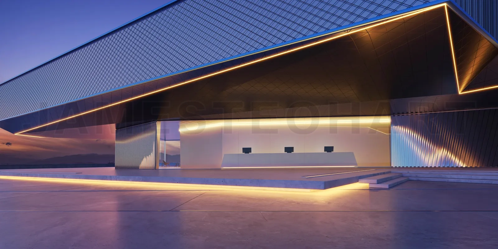 Empty ground in front of modern buildings. Photorealistic 3D rendering.