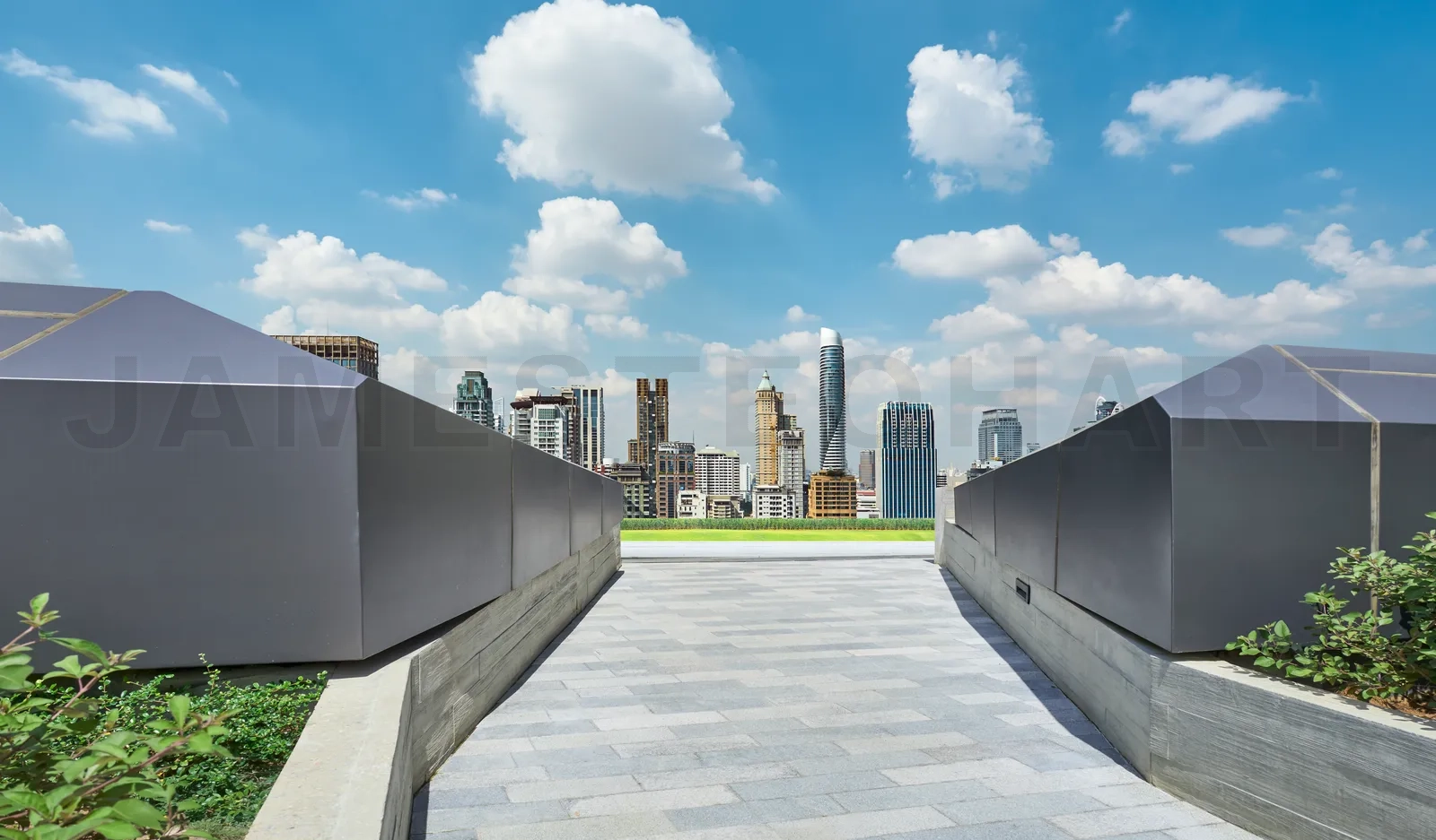 Paved rooftop patio with planters is leading to a green roof with a city skyline in the background on a sunny day