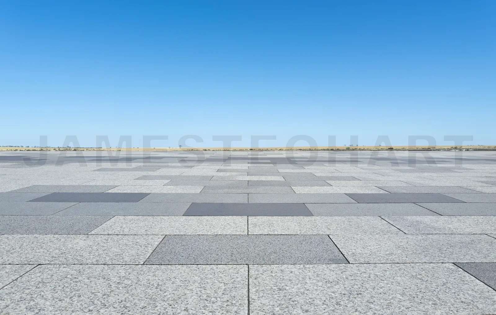 Empty square covered with stone tiles leading to dry landscape under blue sky
