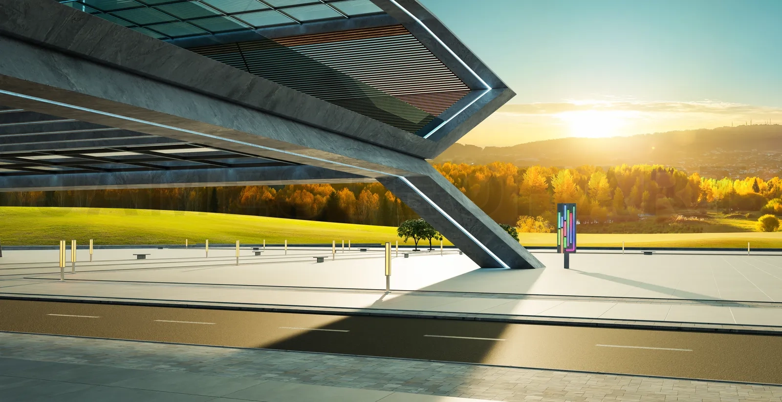 Empty street under the bridge with beautiful sunrise landscape scene. 3d rendering