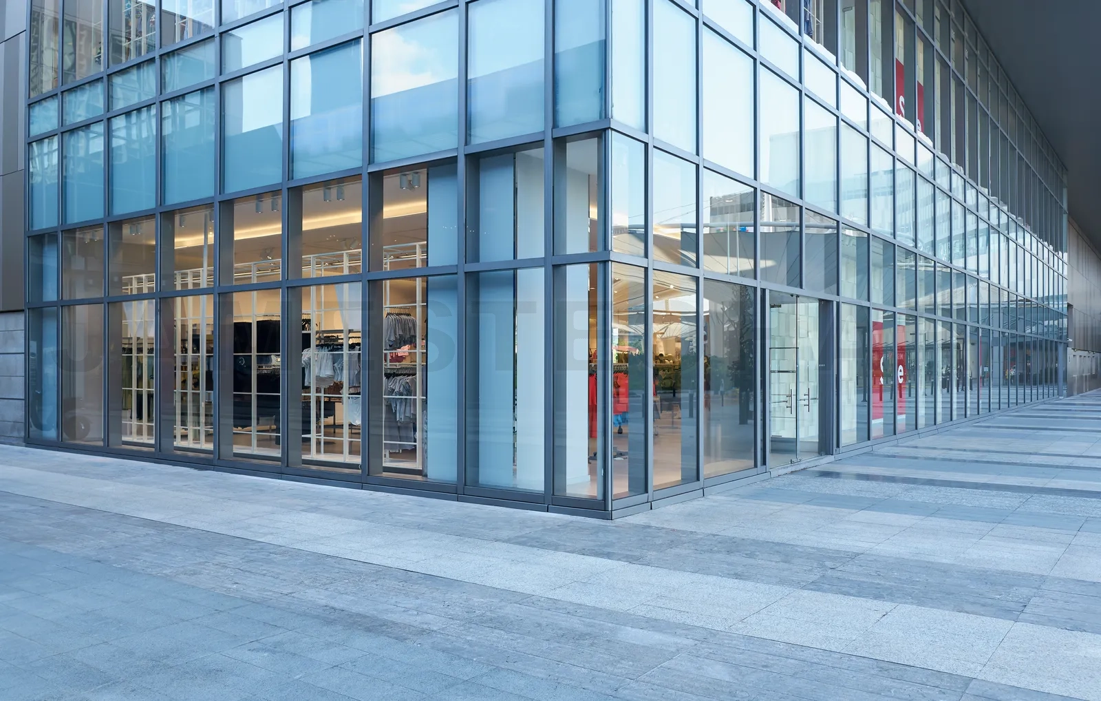 Pedestrian streets and exteriors of shopping mall buildings in the city