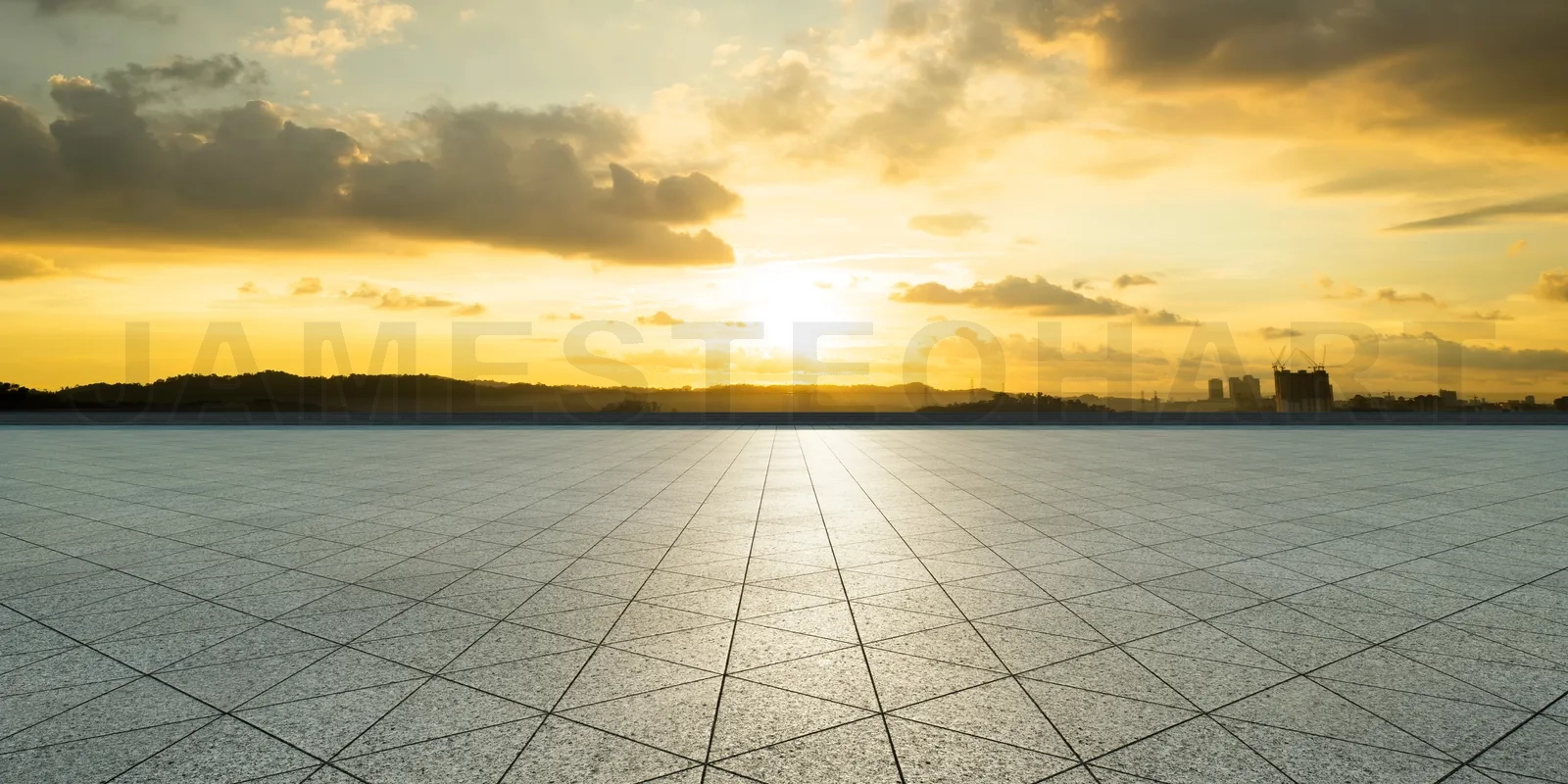 Empty triangle shape stone tiles floor with sky .