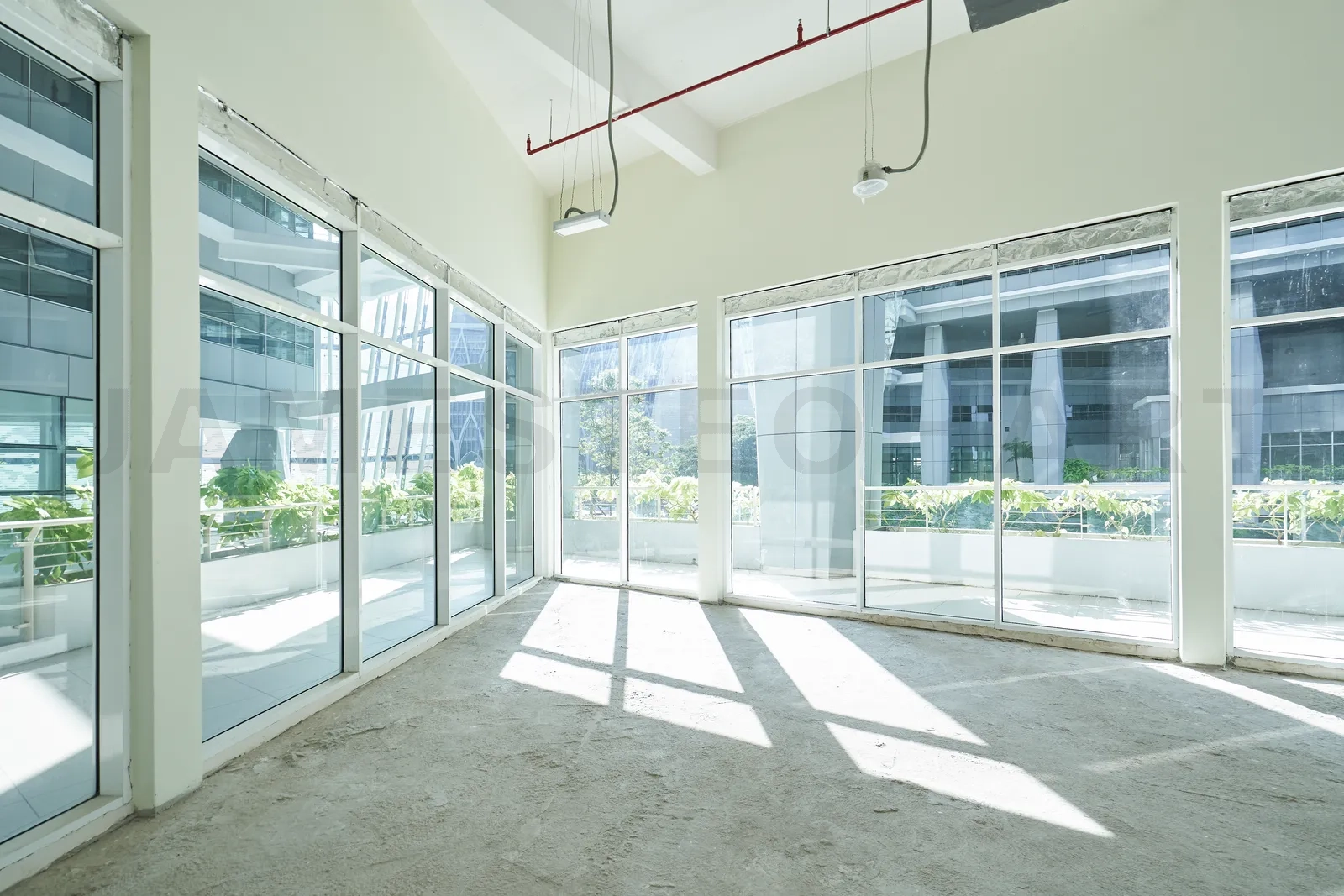 Empty unrenovated office interior with panoramic window .