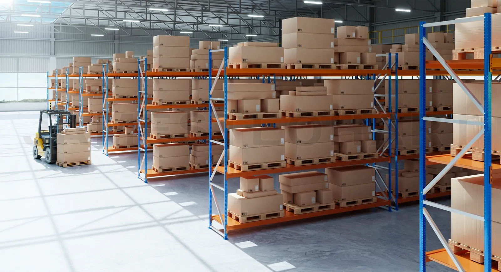 Forklift preparing products for shipment. Warehouse distribution concept. 3d rendering