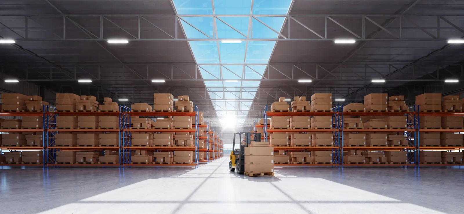 Forklift preparing products for shipment. Warehouse distribution concept. 3d rendering