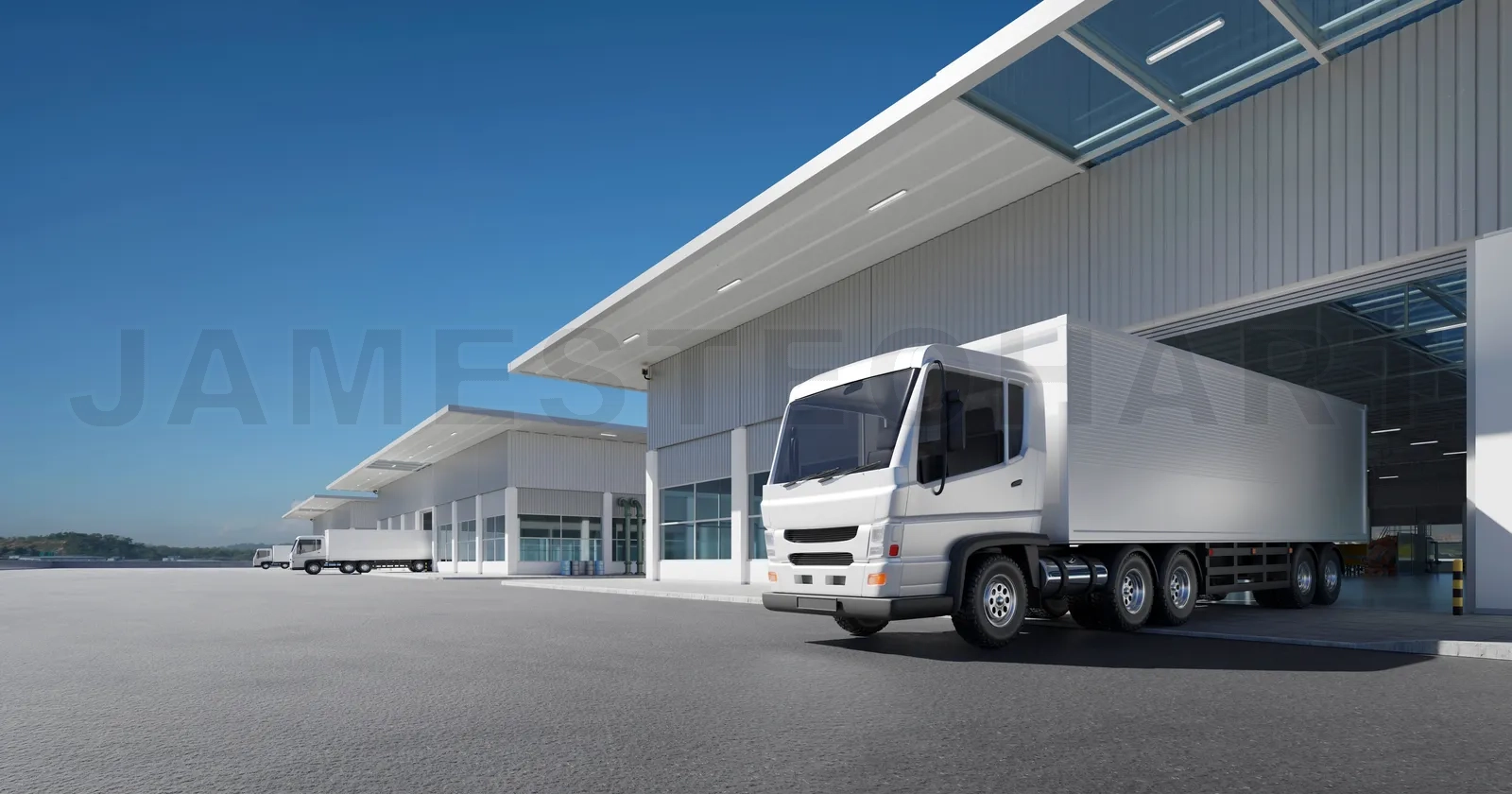 Freight trucks park in the warehouse. Logistics and goods storage concept. 3d rendering