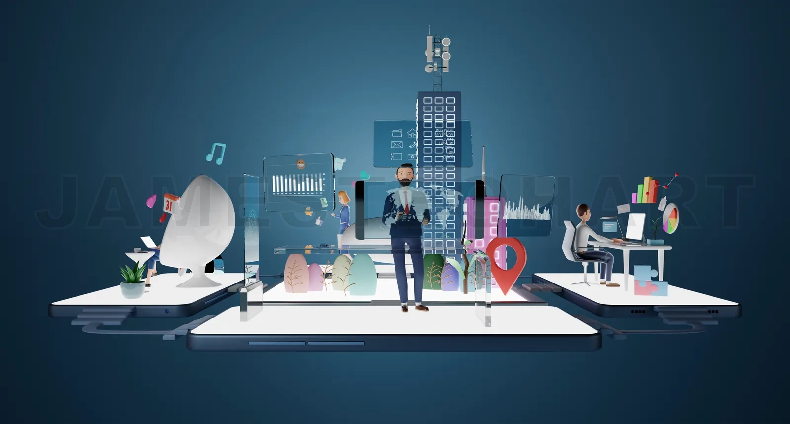 Businessman in suit characters working in virtual office with smart data platform. Analyzing charts, graphs, strategy, managing,online communication, social and serach concept. 3d rendering.