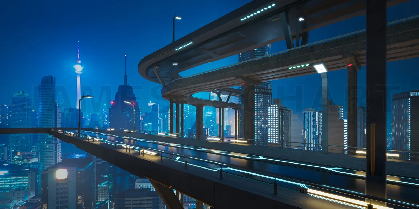 Futuristic highway overpass with glowing lights illuminating modern city skyline at night, showcasing advanced transportation infrastructure