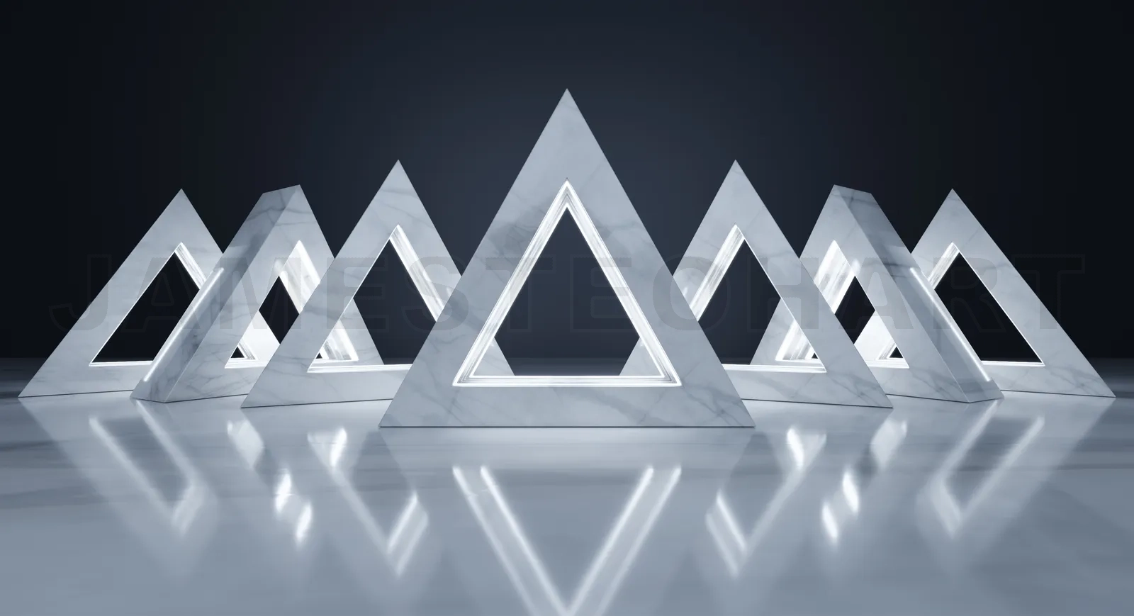 White marble triangular frames emitting light and casting reflections on a glossy surface, creating a modern and minimalist atmosphere. 3D rendering