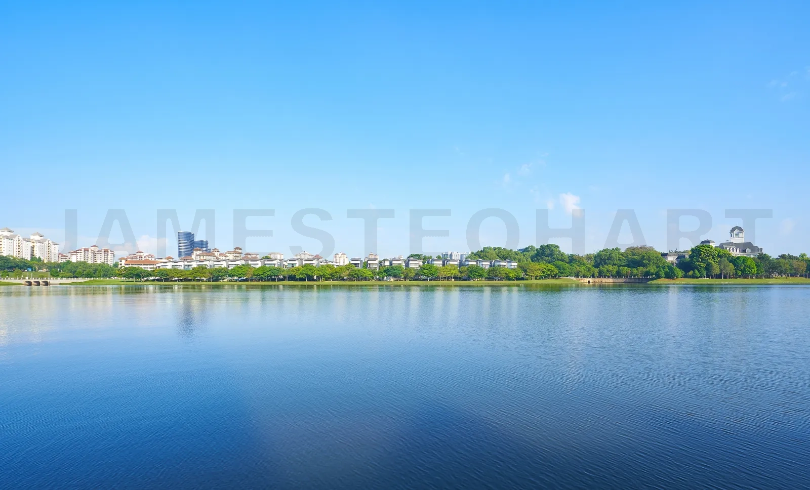 Green park residents in the lake under the blue sky.