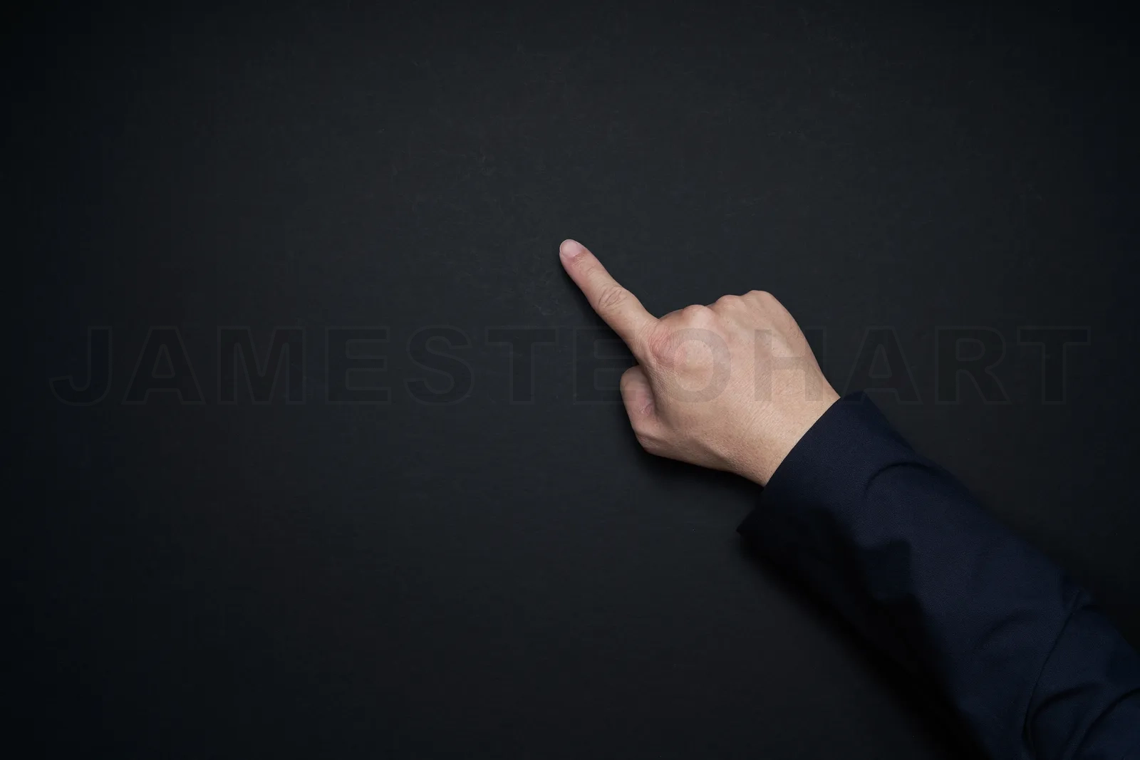 Hand with a business suit jacket sleeve pointing a finger upwards on a dark chalkboard