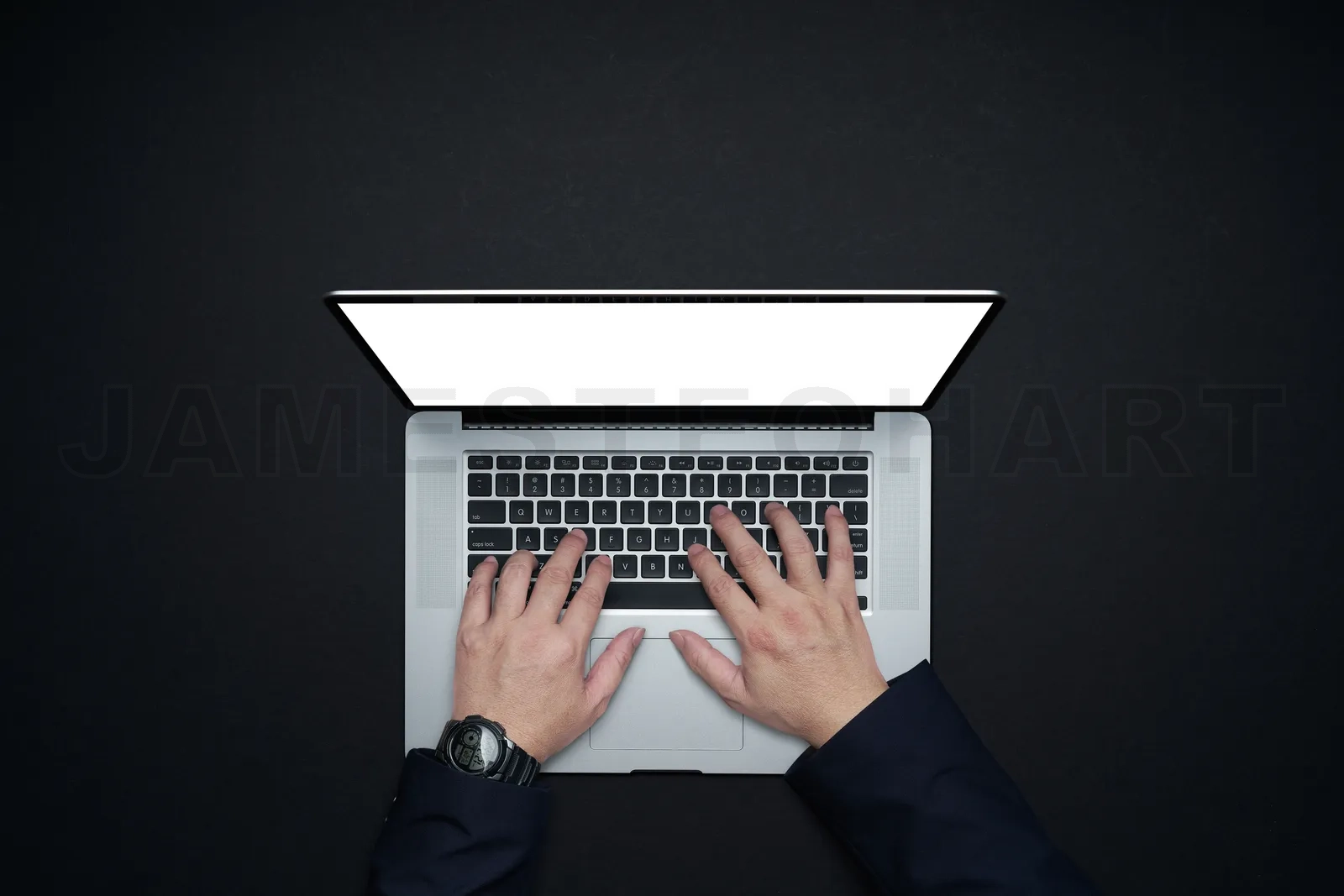Entrepreneur working on computer keyboard at office desk, top view