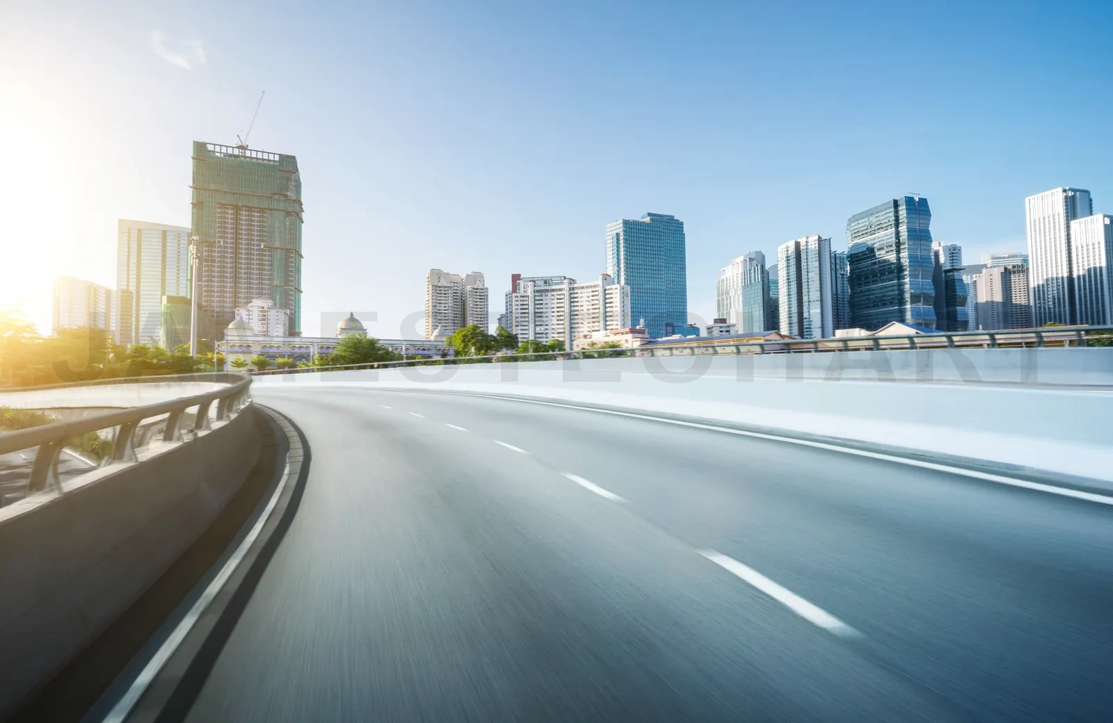 Highway overpass motion blur with city background . sunset scene .