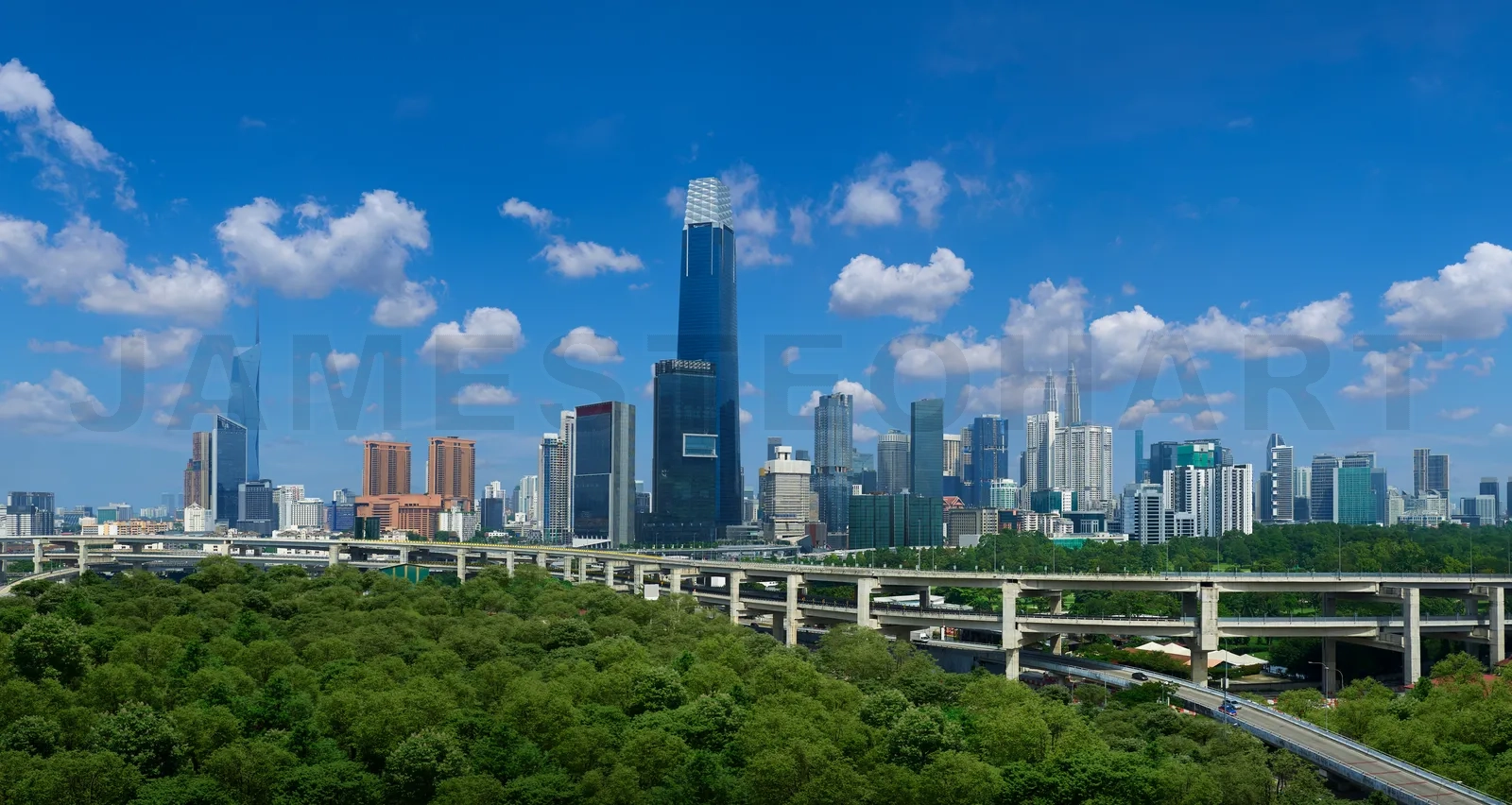 Modern metropolis of kuala lumpur showcases its impressive skyline, juxtaposed with a vibrant green forest and a bustling elevated highway under a clear blue sky