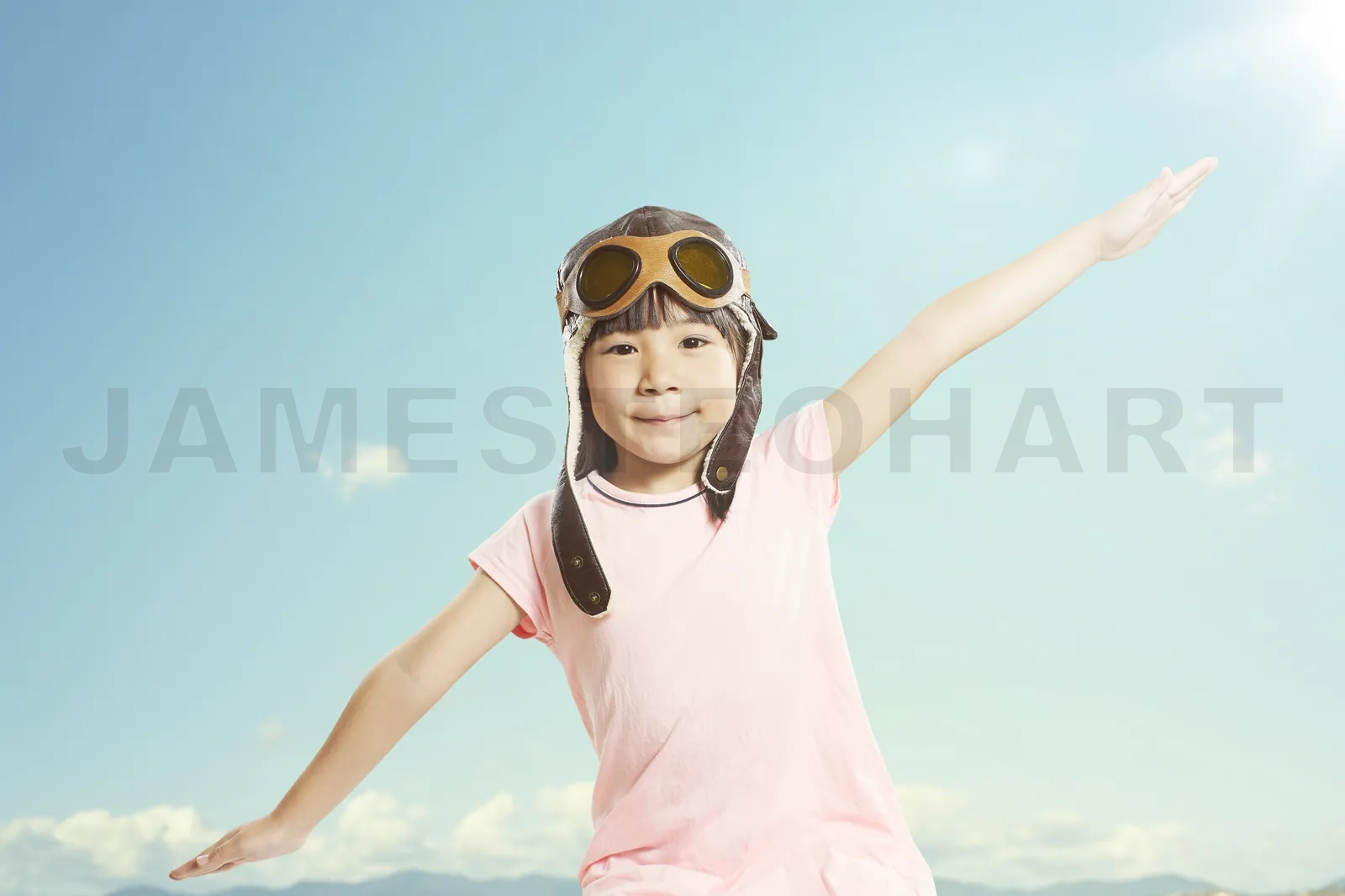 Little asian girl wear aviator glasses and enjoy her travel dreams , summer sky background .