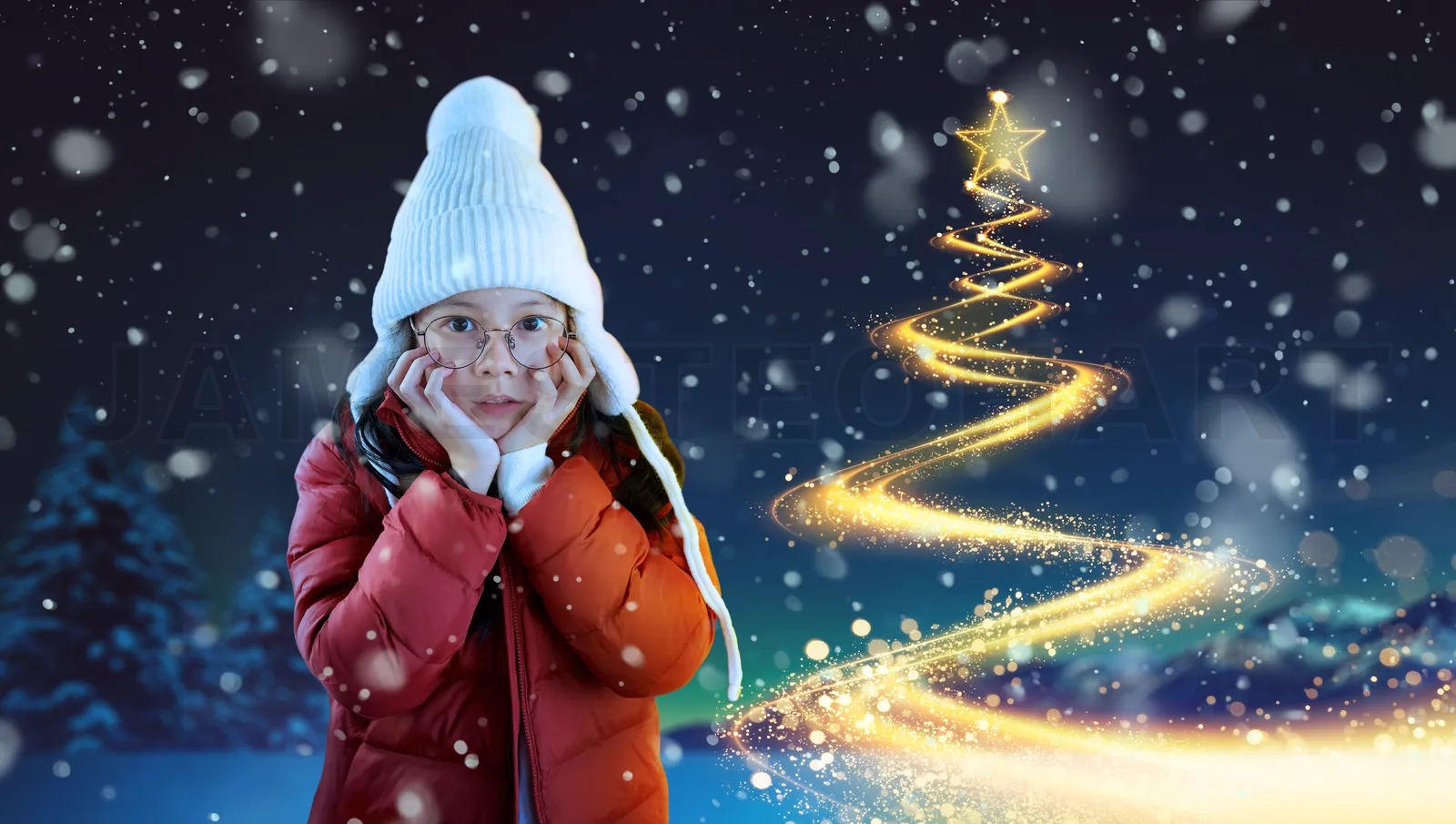 Child experiencing christmas magic with snow falling around a sparkling winter tree