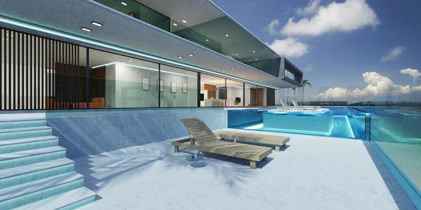 Luxury villa exterior design with beautiful seascape at the infinity pool. 3d rendering