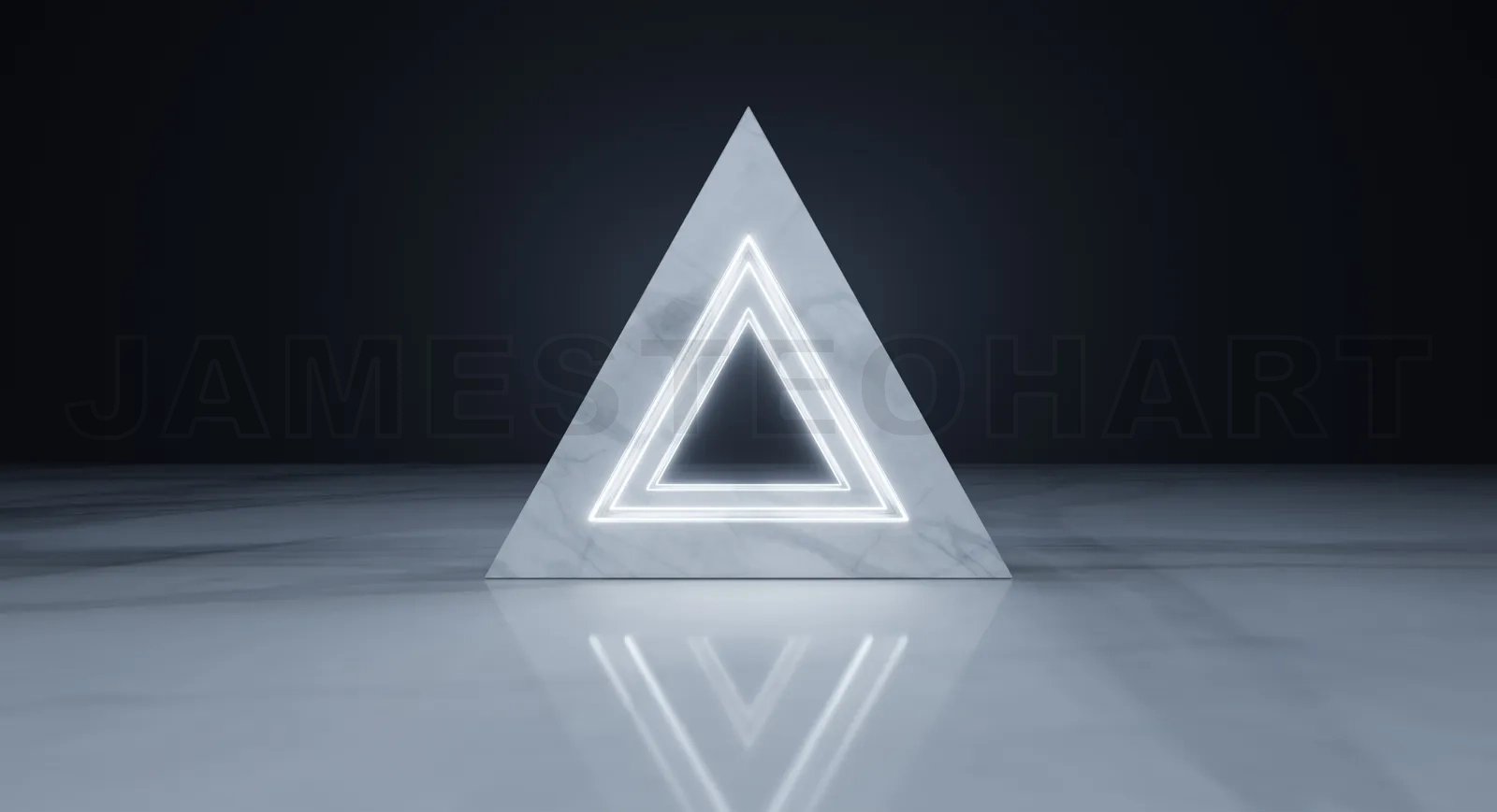 Glowing neon triangle illuminating marble pyramid structure on reflective floor. 3D rendering