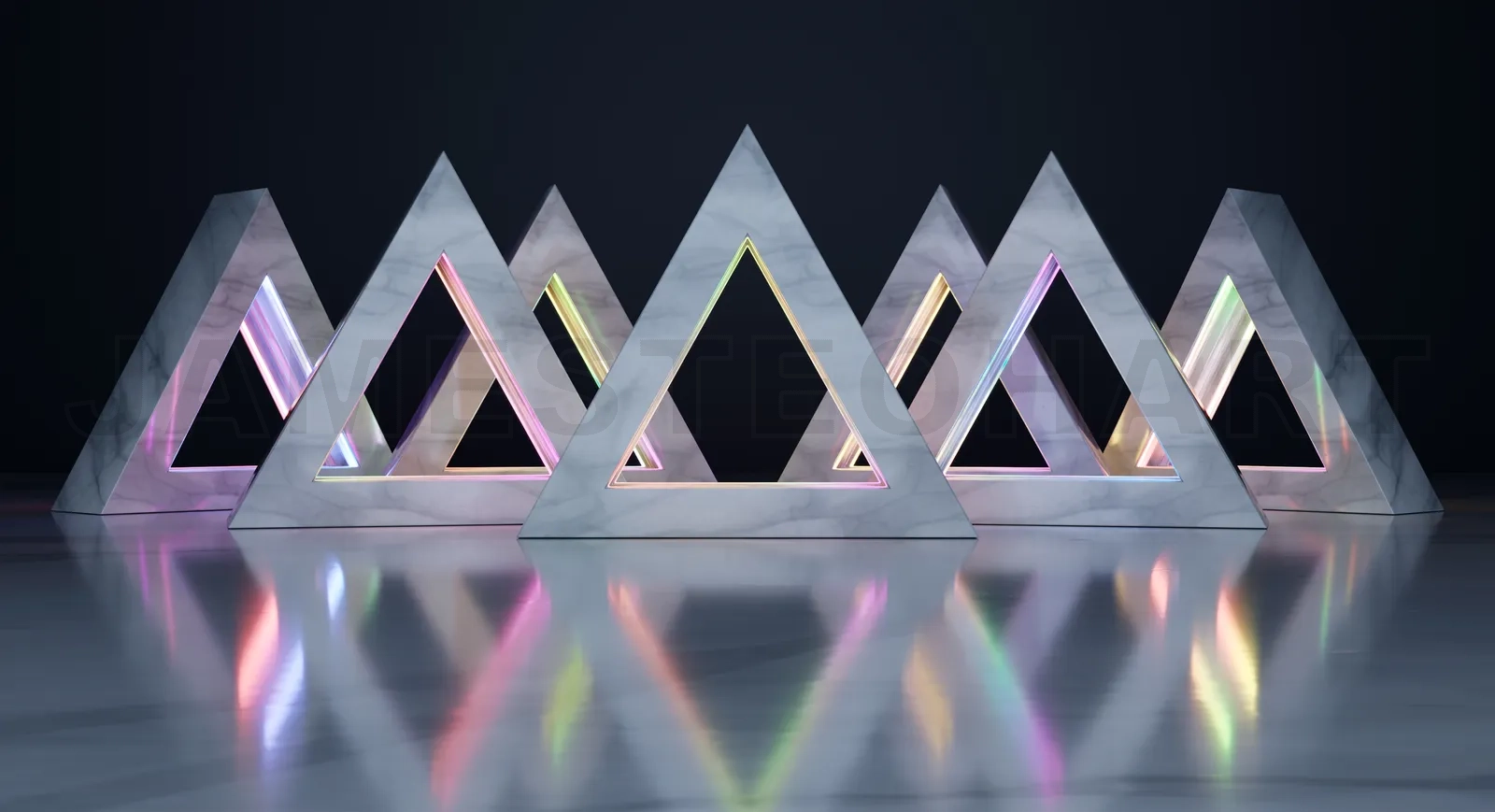 Marble triangles with glowing neon lights are creating a futuristic and modern atmosphere on a reflective surface. 3D rendering
