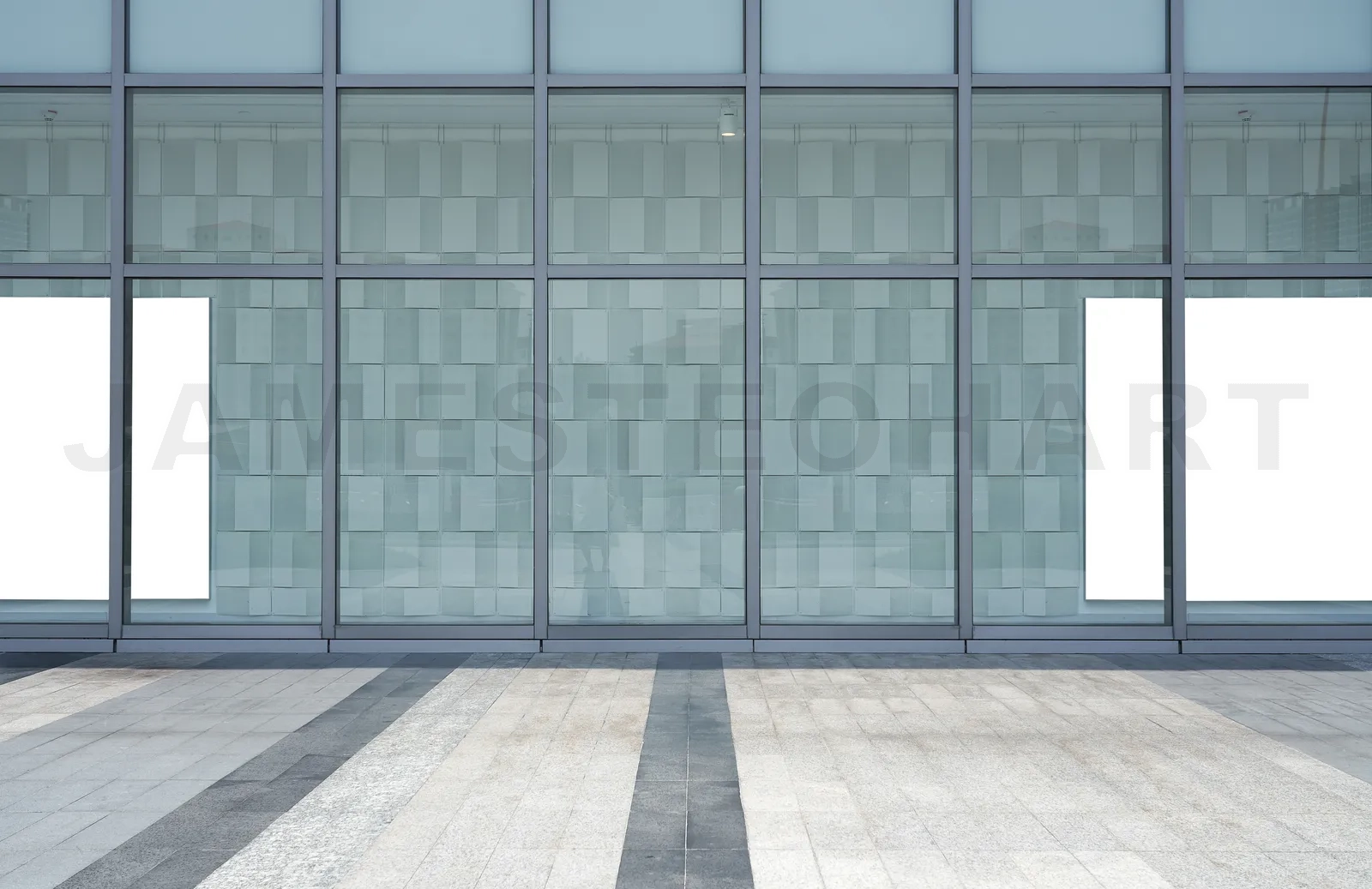 Modern building facade with blank billboards on a city sidewalk for advertising