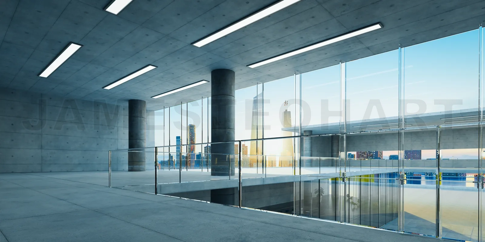 Modern glass wall commercial buildings empty space. Realistic 3d rendering