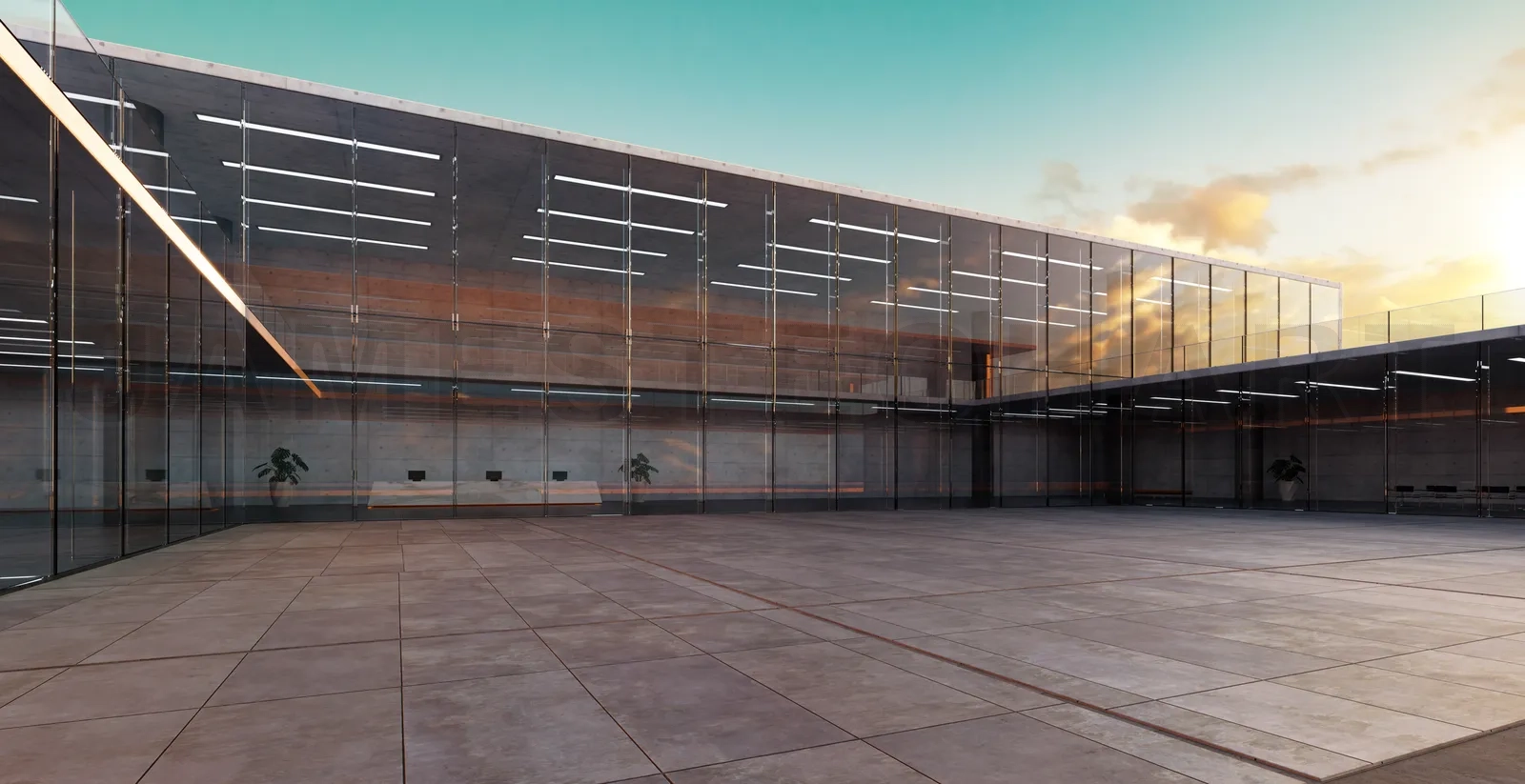 Modern glass wall commercial buildings exterior. Realistic 3d rendering