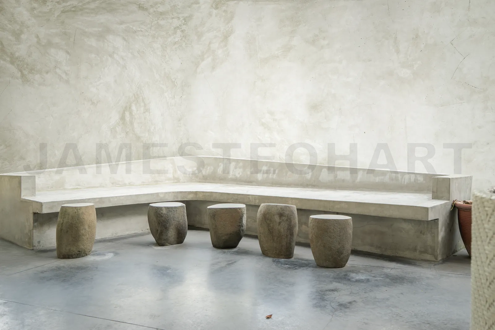 Concrete bench and stone stools creating a relaxing atmosphere in a modern minimalist interior