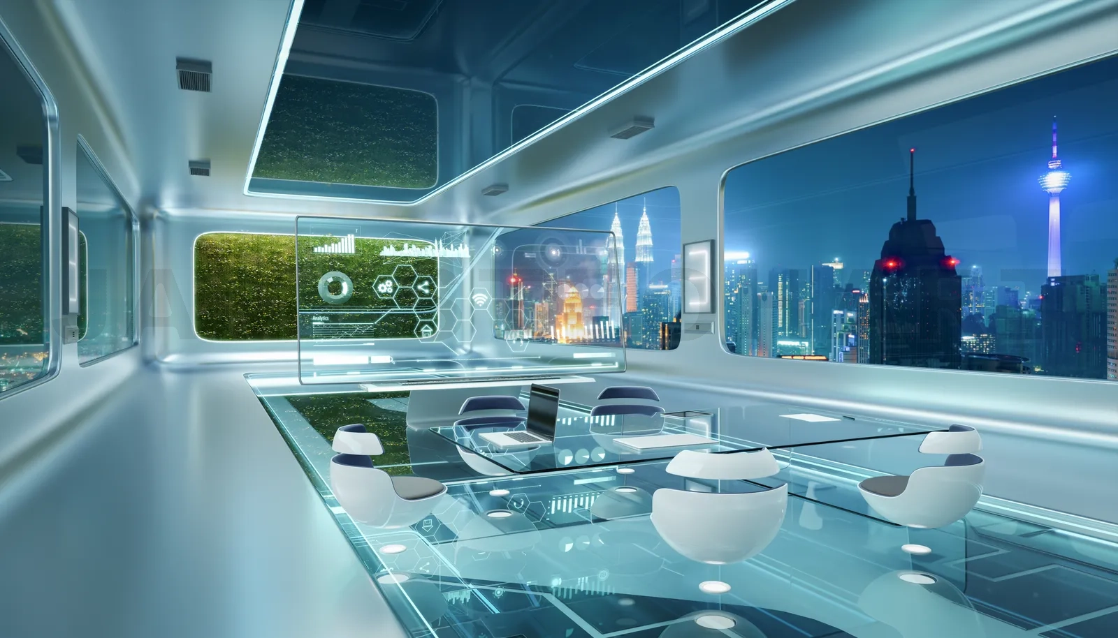 Futuristic interior office design with green wall plant and beautiful night scene cityscape view. 3d rendering