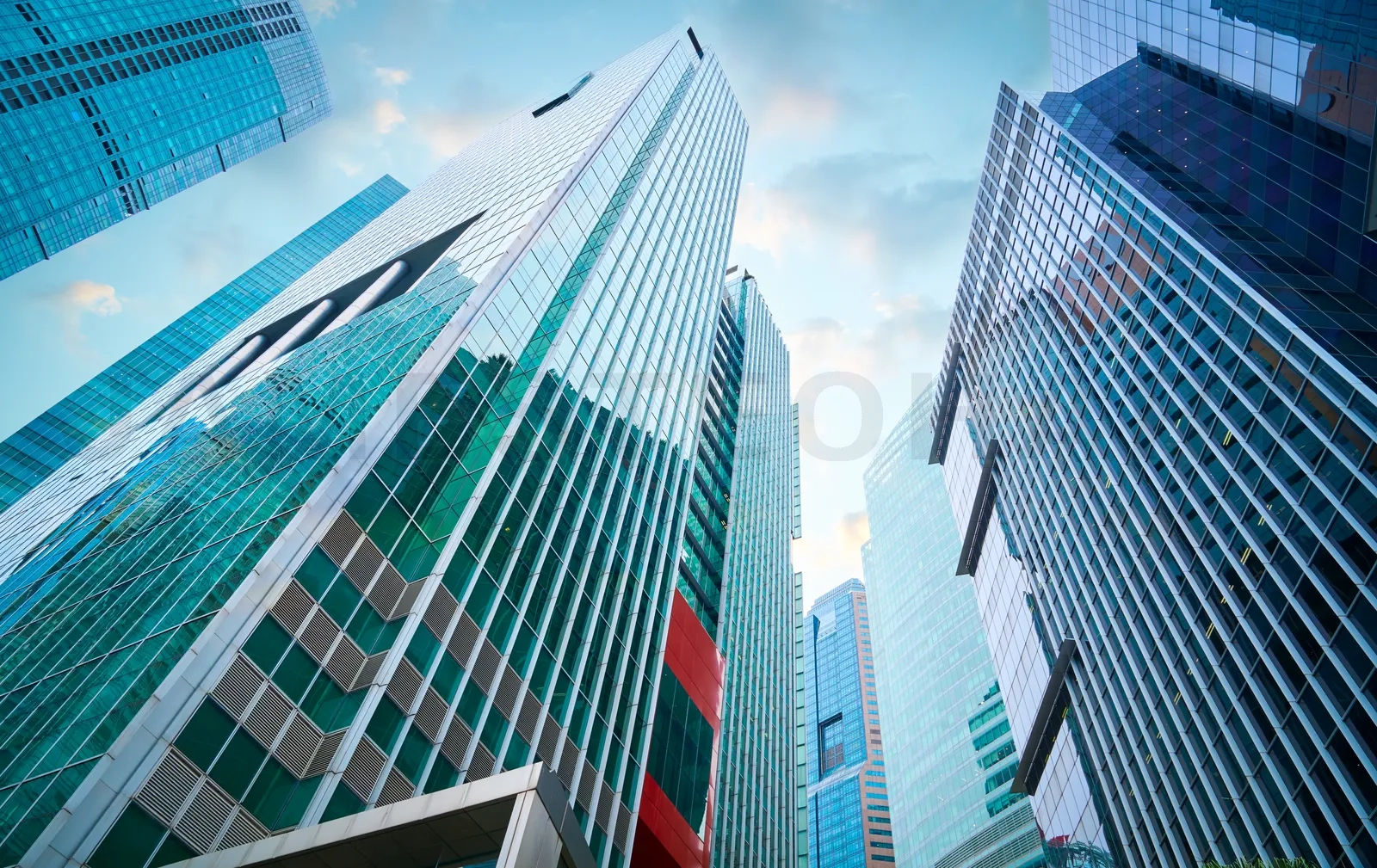 Low angle view of modern skyscrapers in singapore’s cbd, showcasing urban development and economic growth