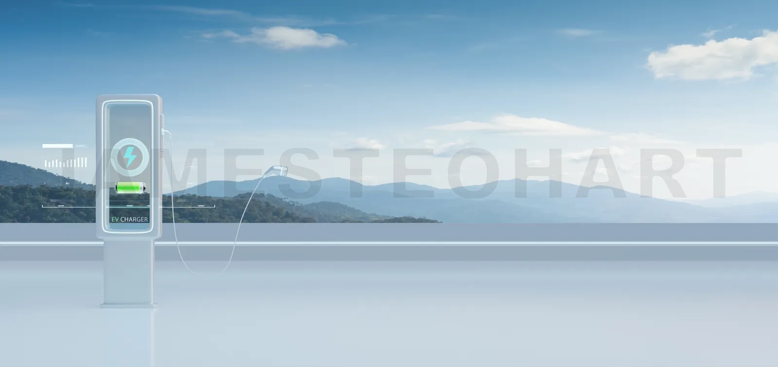 Modern UI control information display charging station. Future of mobility and Alternative sustainable Eco energy concept. 3d render and illustration
