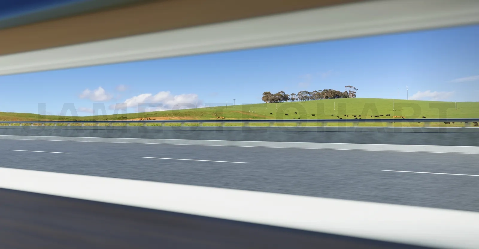 Moving highway road. Unique perspective side view from railing with natural farm landscape background.
