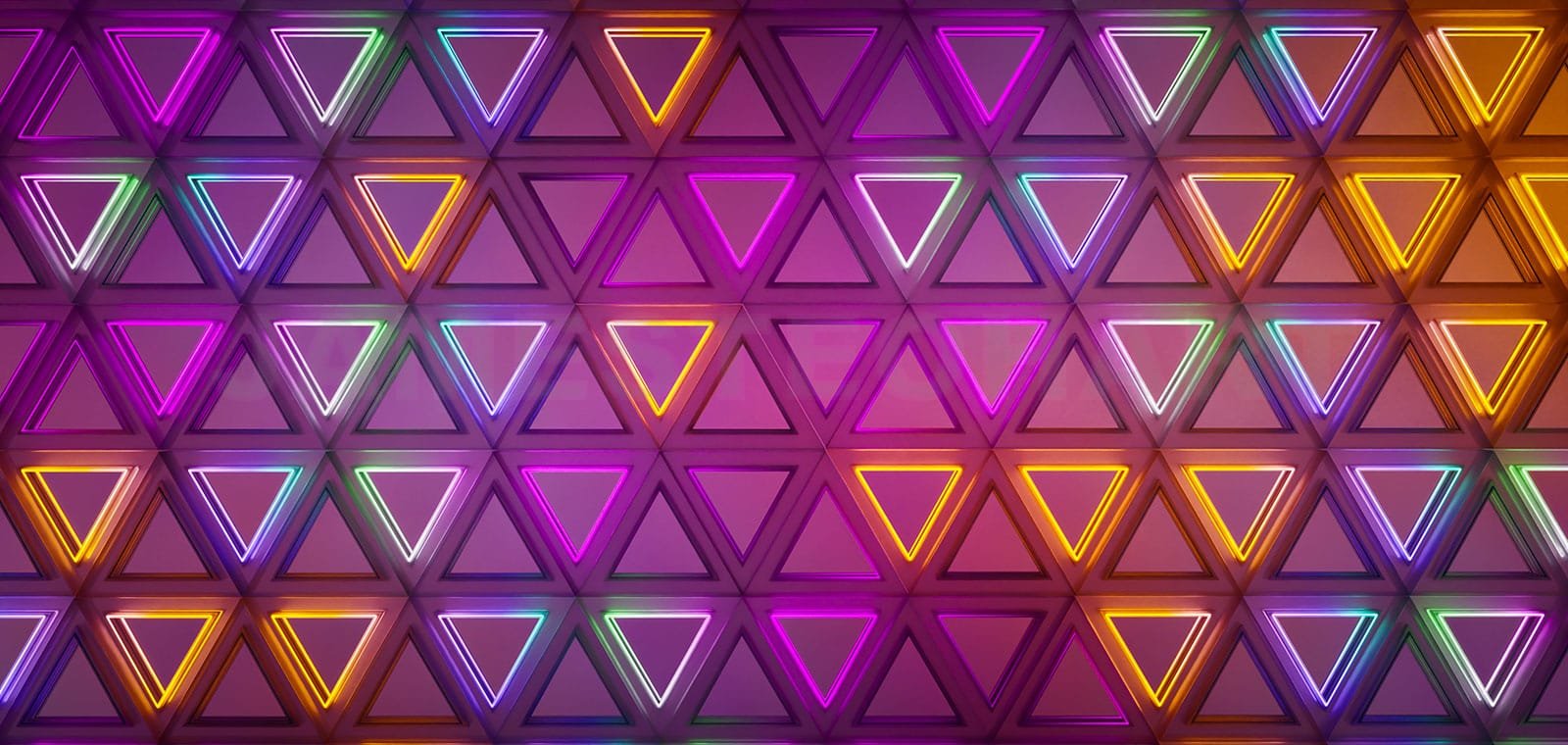 A dynamic abstract visualization featuring a repetitive hexagonal grid filled with brightly glowing neon outlines of triangles in varied colors like magenta cyan and yellow