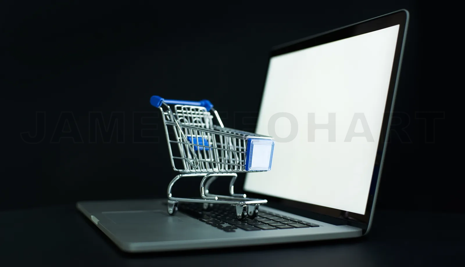 Miniature shopping cart on a laptop keyboard, symbolizing e-commerce