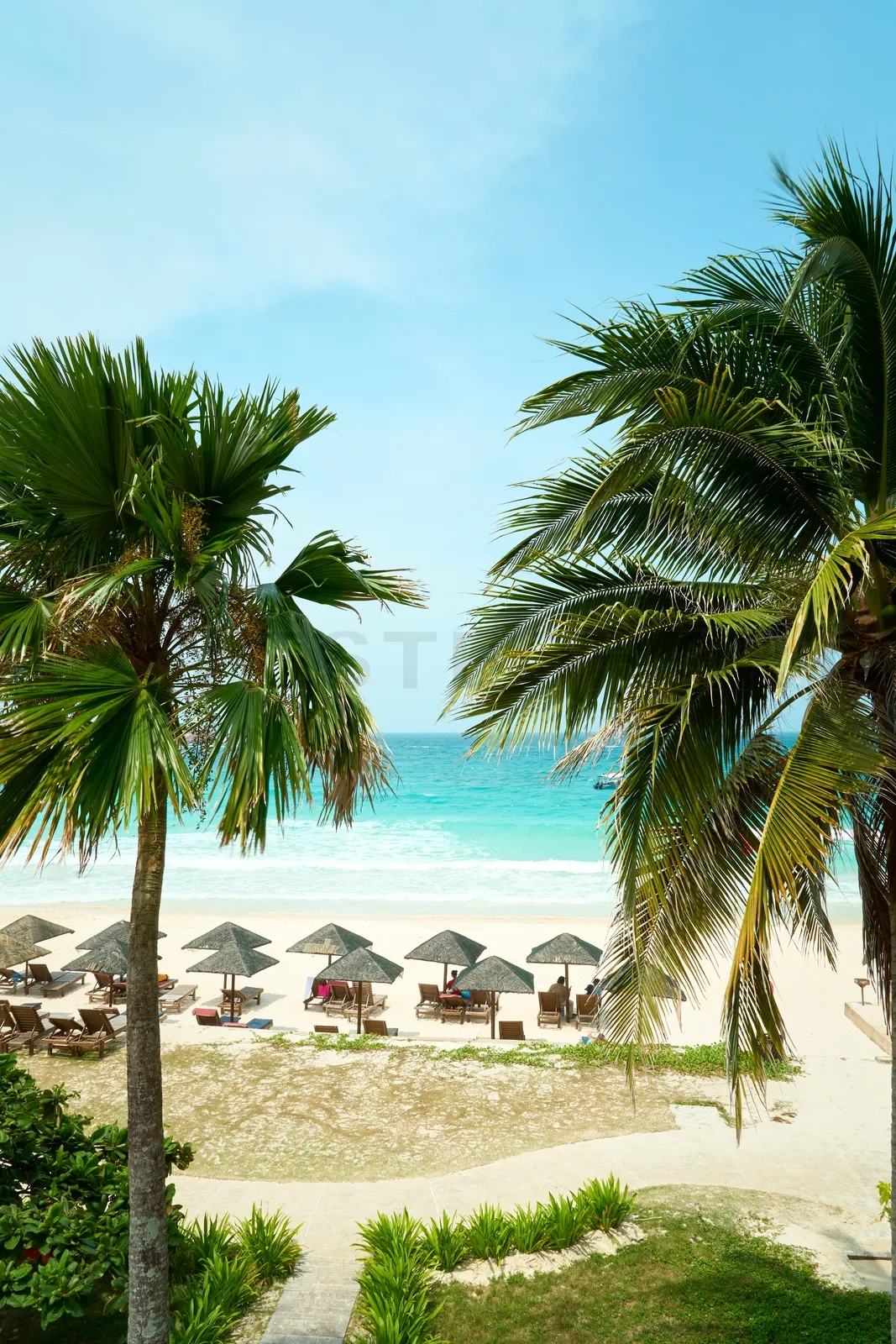 Tourists are enjoying a sunny day at the beach, relaxing on sunbeds under straw umbrellas