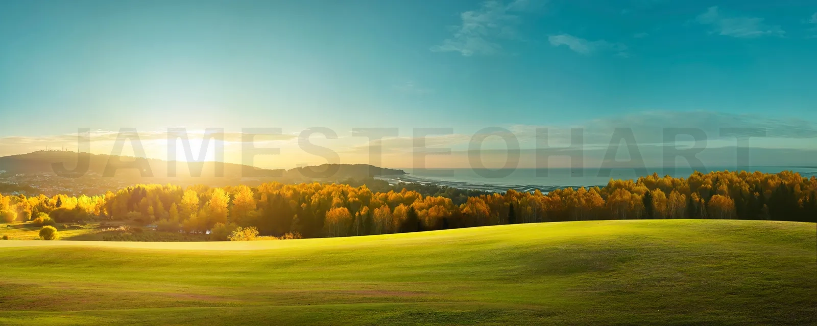 Panorama view of greenfield and beautiful landscape. Sunrise scene