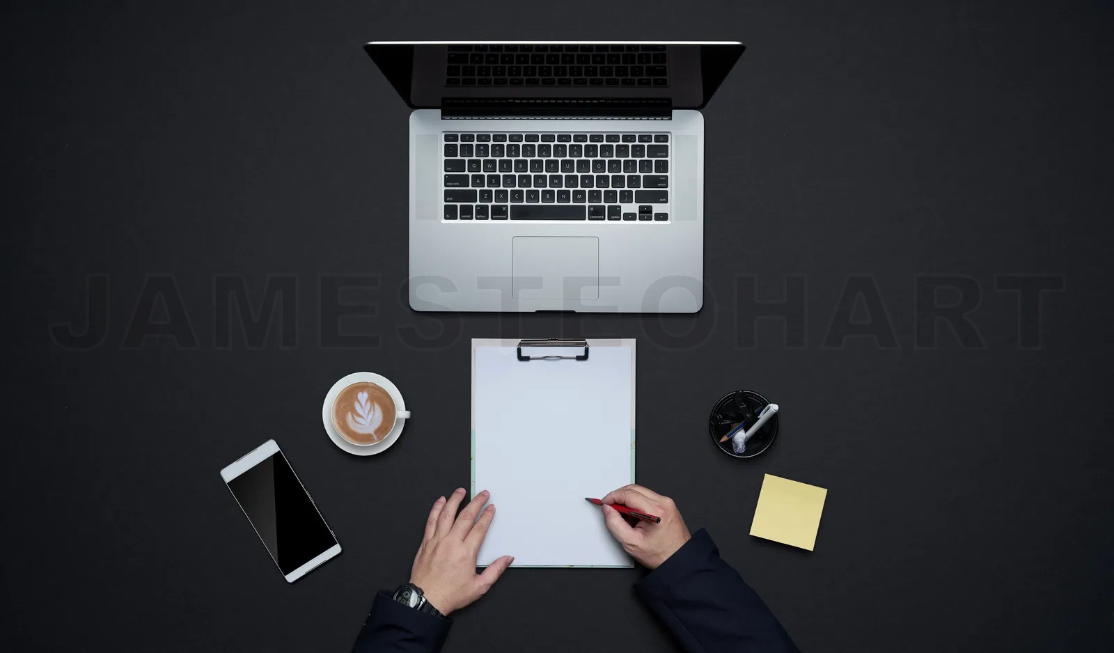 Person writing on a clipboard, surrounded by a laptop, coffee, and smartphone, illustrating productivity