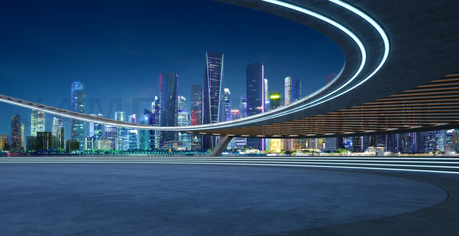 Perspective view of empty concrete floor with cement staircase and wood strip roof decoration. 3d rendering