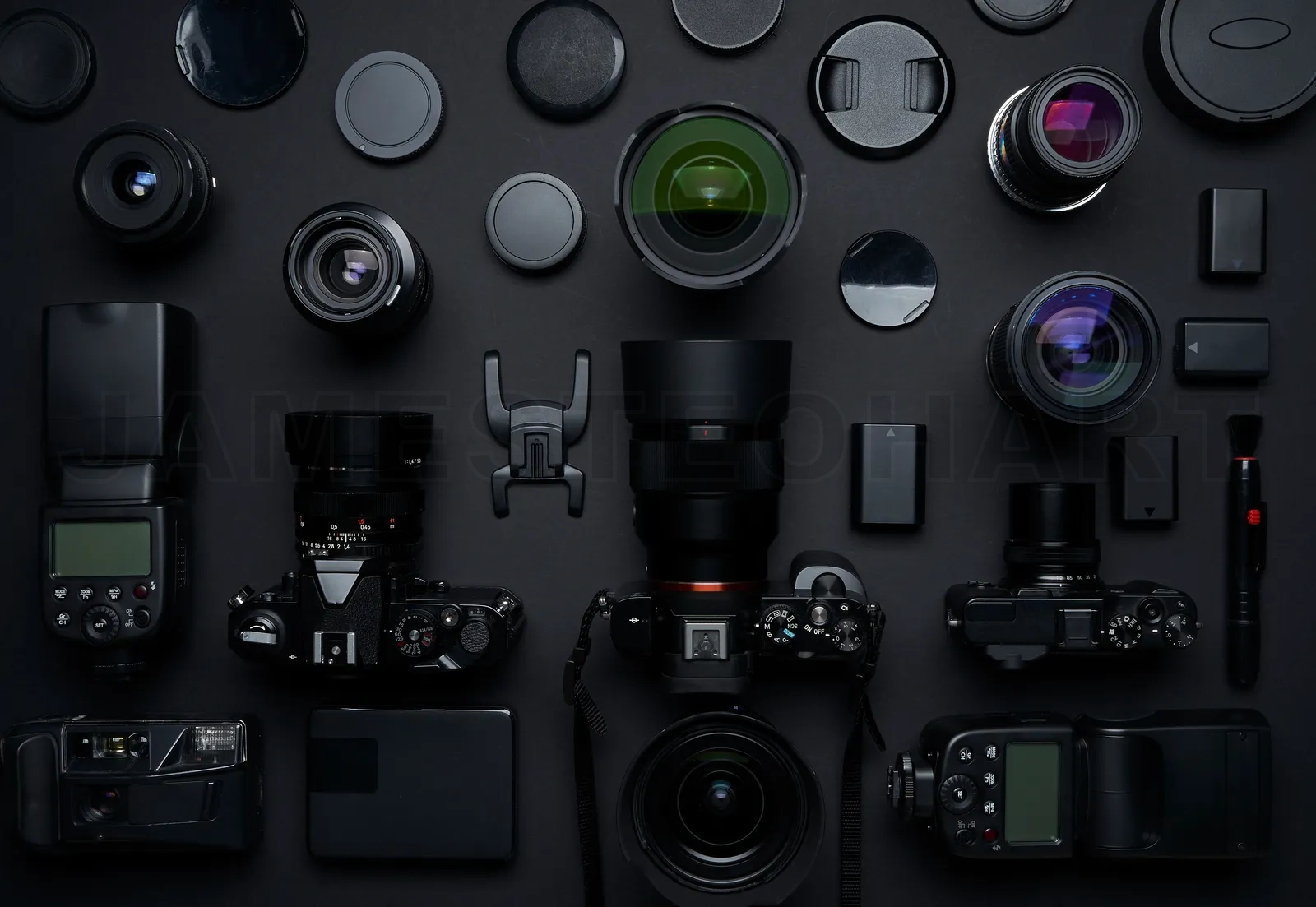Photography equipment and accessories displaying a professional photographer’s tools