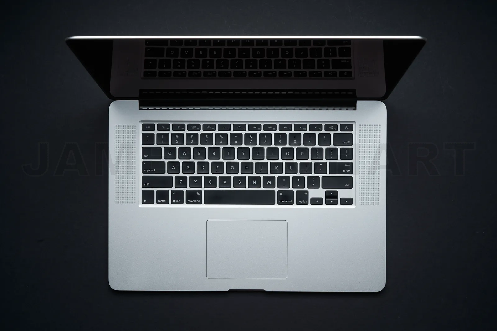Laptop displaying keyboard reflection, creating a smart technology workspace from above