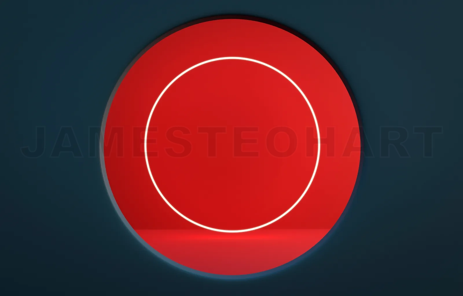 Prussian blue color wall with round shape window with red wall and round shape led light inside. Photorealistic 3D rendering.